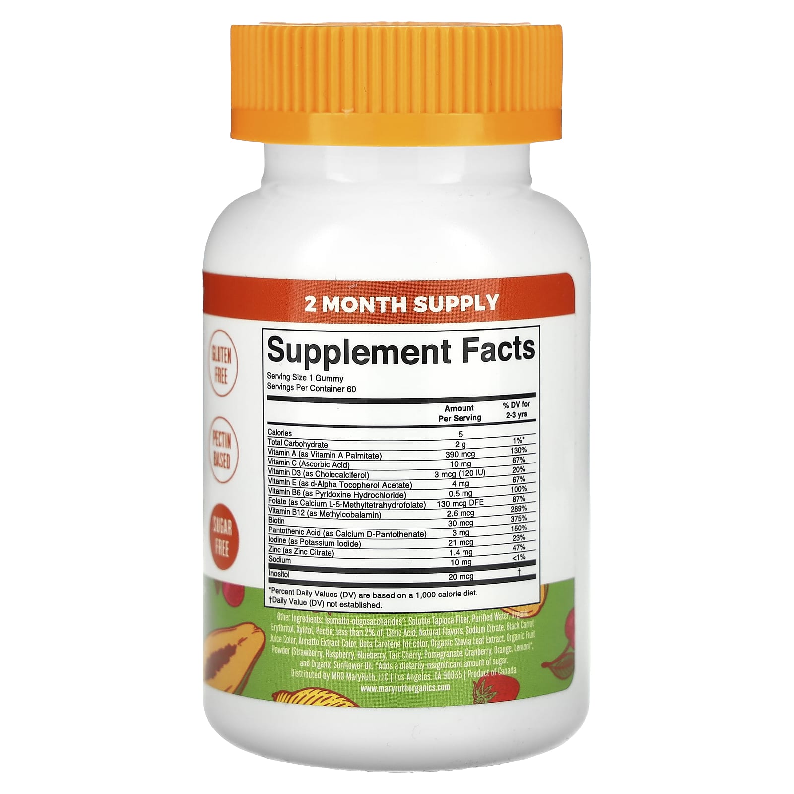 Изомальтоолигосахариды^. растворимая тапиоковая клетчатка, очищенная вода, эритритол, ксилитол, пектин; менее 2% лимонной кислоты, натуральные ароматизаторы, цитрат натрия, краситель для сока черной моркови, экстракт аннато (краситель), бета-каротин (краситель), органический экстракт листьев стевии, порошок из органических фруктов (клубника, малина, голубика, вишня, гранат, клюква, апельсин, лимон)^, органическое подсолнечное масло.