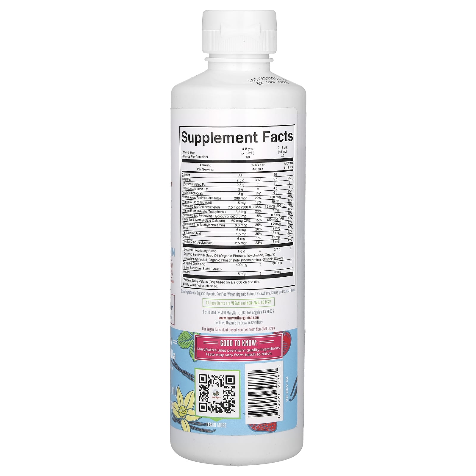 MaryRuth's, органические липосомальные мультивитамины, для детей от 4 до 13 лет, со вкусом клубники, вишни и ванили, 450 мл (15,22 жидк. унции)