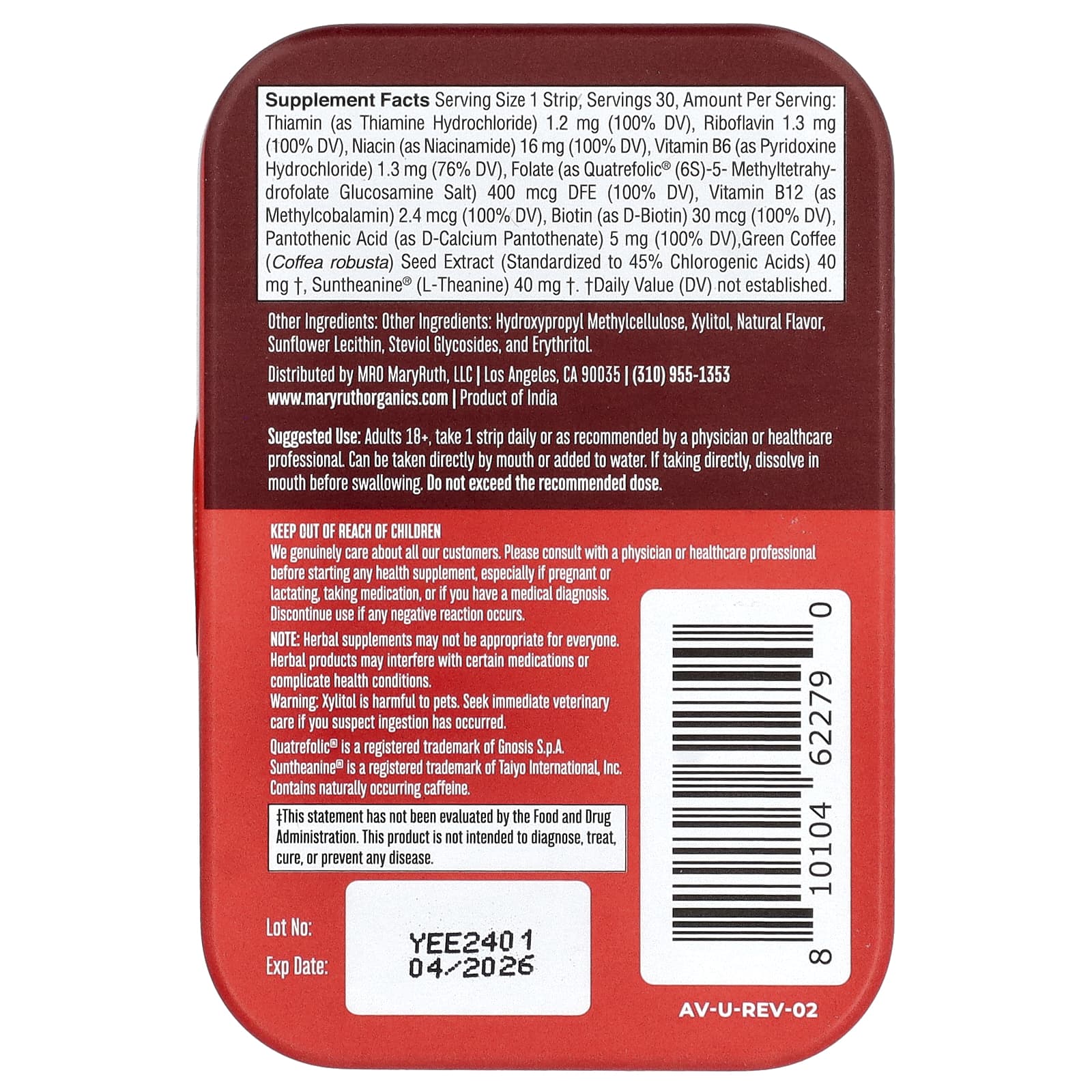 Каждая порция содержит все восемь незаменимых витаминов группы B - тиамин, рибофлавин, ниацин, витамин B6, фолат, витамин B12, биотин и пантотеновую кислоту, а также экстракт семян зеленого кофе (Coffea robusta) и L-теанин.