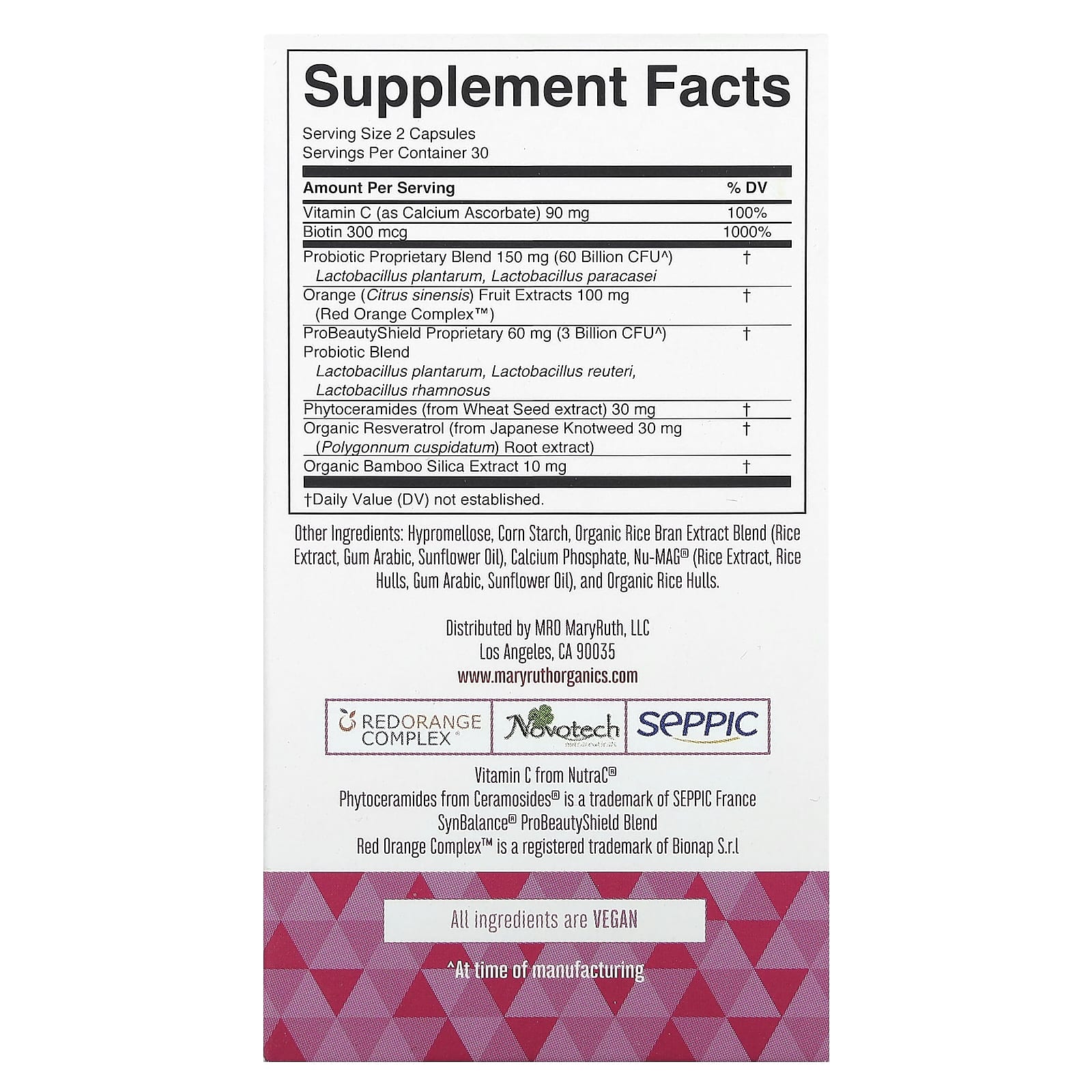 | Запатентованная компания ProBeautyShield Смесь пробиотиков лактобактерии плантарум (Lactobacillus plantarum), лактобактерии реутери (Lactobacillus reuteri), лактобактерии рамнозус (Lactobacillus rhamnosus) | 60 мг (3 млрд КОЕ^) | † |