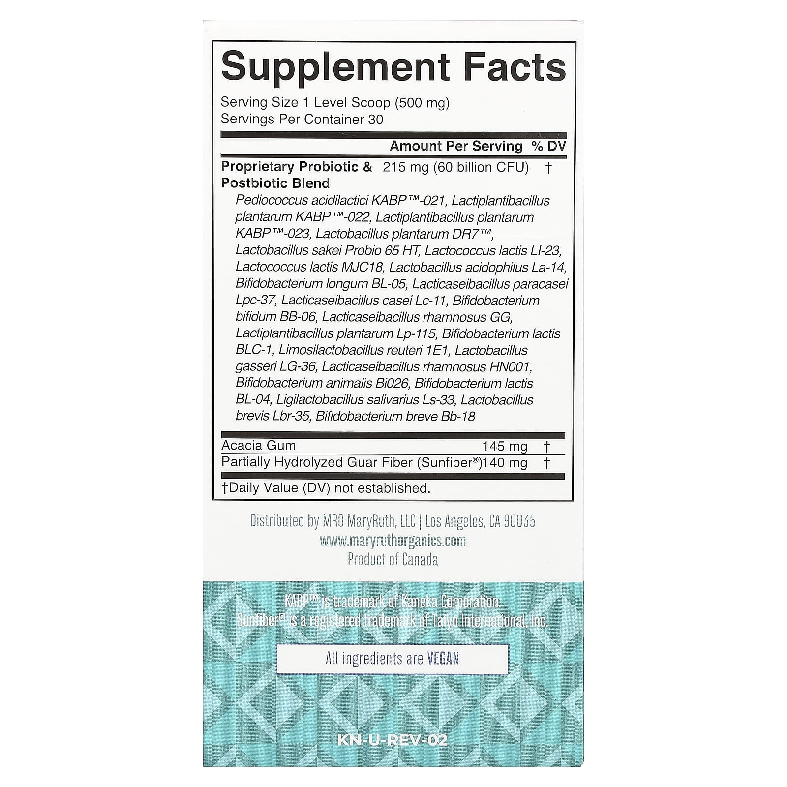 | Запатентованный пробиотик Постбиотическая смесь Педиококк ацидилакти (Pediococcus acidilacti) KABP™-021, лактиплантибактерии plantarum KABP™-022, лактобактерии плантарум (Lactilantibacillus plantarum) KABP™-023, лактобактерии плантарум (Lactobacillus plantarum) DR7™, лактобактерии сакеи (Lactobacillus sakei) Probio 65 HT, лактококк молочный (Lactococcus lactis) LI-23, лактококк (Lactococcus lactis) MJC18, ацидофильные лактобактерии La-14, Бифидобактерии лонгум (Bifidobacterium longum) BL-05, лактобактерии параказеи (Lactactaseibacillus paracasei) Lpc-37, лактобактерии казеи (Lactaseibacillus casei) Lc-11, бифидобактерии бифидум (bifidum) BB-06, лактобактерии рамнозус (Lactaseibacillus rhamnosus) GG, лактобактерии плантарум (L. plantarum) Lp-115, бифидобактерии лактис (Bifidobacterium lactis) BLC-1, лимонилактобактерии реутери (Limosilactobacillus reuteri) 1E1, лактобактерии gasseri LG-36, лактобактерии рамнозус (Lactaseibacillus rhamnosus) HN001, бифидобактерии животного происхождения (Bifidobacterium animalis) Bi026, бифидобактерии лактис (Bifidobacterium lactis) BL-04, лигилактобактерии саливариус (Ligilactobacillus salivarius) Ls-33, лактобактерии brevis Lbr-35, бифидобактерии бреве Bb-18 | 215 мг (60 млрд КОЕ) | † |