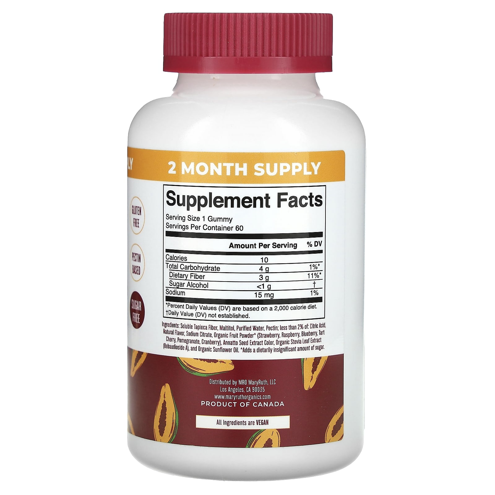 Растворимая тапиоковая клетчатка, мальтит, очищенная вода, пектин; менее 2% лимонной кислоты, натуральный ароматизатор, цитрат натрия, порошок из органических фруктов^ (клубника, малина, голубика, вишня, гранат, клюква), экстракт семян аннато (краситель), органический экстракт листьев стевии (ребаудиозид A), органическое подсолнечное масло.