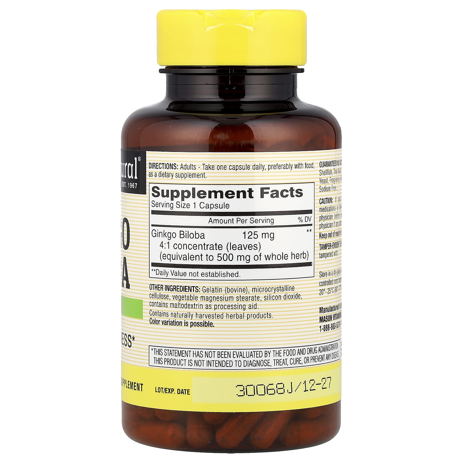 Mason Natural, цельное растение гинкго билоба, 180 капсул (125 мг в 1 капсуле)