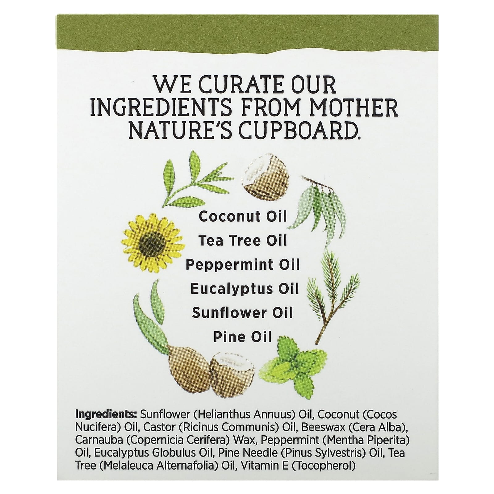 Подсолнечное масло (Helianthus annuus), кокосовое масло (Cocos nucifera), касторовое масло (ricinus communis), белый воск (Cera alba), карнаубский воск (Copernicia cerifera), масло перечной мяты (Mentha piperita), масло эвкалипта шаровидного (Eucalyptus globulus), масло хвои (Pinus sylvestris), масло чайного дерева (Melaleuca alternafolia), витамин E (токоферол).