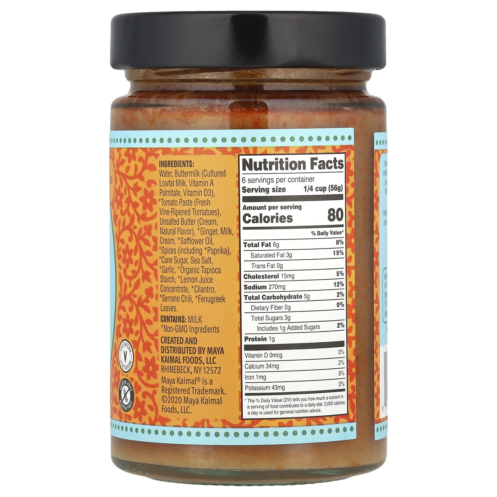 Вода, пахта (кисломолочный, пальмитат витамина A, витамин D3), * томатная паста (свежие созревшие помидоры), несоленое масло (сливки, натуральный ароматизатор), * имбирь, молока, сливки, * сафлоровое масло, * специи (включая * перец), * выпаренный тростниковый сахар, морская соль, * чеснок, * органический тапиоковый крахмал, * концентрат лимонного сока, * кинза, * чили серрано, * листья пажитника.