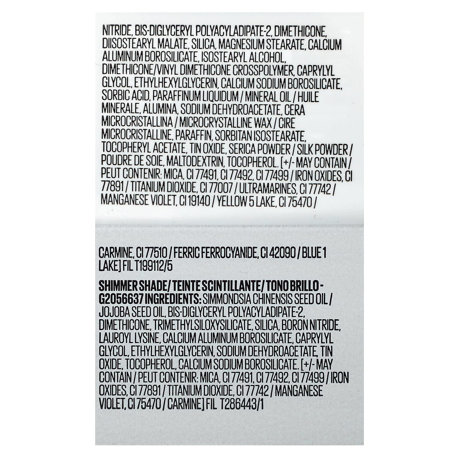 Матовые оттенки: Каприловый / каприновый триглицерид нейлон-12, тальк нитрид бора, бис-диглицерил полиациладипат-2, диметикон, диизостеарил малат, диоксид кремния, стеарат магния, кальций алюминий боросиликат, изостеариловый спирт, диметикон/винил диметикон кроссполимер, каприлилгликоль, этилгексилглицерин, кальций натрий боросиликат, сорбиновая кислота, жидкий парафин / минеральное масло / Huile Minerale, оксид алюминия, дегидроацетат натрия, cera microcristallina / микрокристаллический воск / Cire microcristalline, парафина, сорбитан изостеарат, токоферилацетат, оксид олова, порошок из серики / шелковая пудра / соя, мальтодекстрин, токоферол. [+/- может содержать / peut contenir: mica, CI 77491, CI 77492, CI 77499), диоксид титана (CI 77891), ультрамарин (CI 77007), ci 77742 | марганцево-фиолетовый, CI 19140 / желтый 5 лак, кармин (CI 75470), CI 77510 / ферроцианид железа, CI 42090 / Blue 1 Lake].