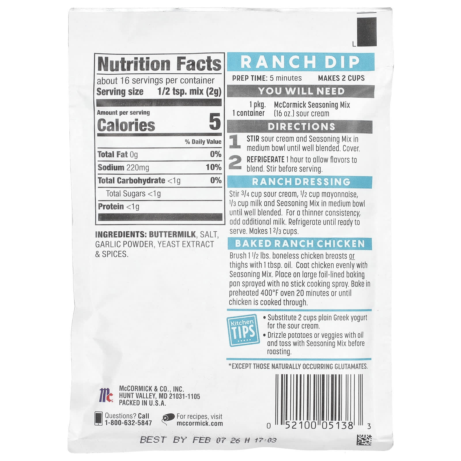 Всего 5 простых ингредиентов — таков состав смеси для соуса, заправки и приправ для ранчо от McCormick по-домашнему. Используйте эту универсальную смесь для приготовления свежего соуса или заправки для ранчо или вкусной приправы к жареной курице с картофелем. Наша приправа не содержит глютена, искусственных ароматизаторов или добавленного глутамата натрия*. Поэтому вы можете хранить несколько пакетиков под рукой. Его можно использовать разными способами. Приготовьте сливочный соус для свежих овощей или домашнюю заправку для зелени или картофельного салата. На обед она является яркой приправой для мяса и овощей. Благодаря понятной этикетке и ингредиентам с понятными названиями наша смесь Rannch поможет создать вкусные блюда для вашей семьи.