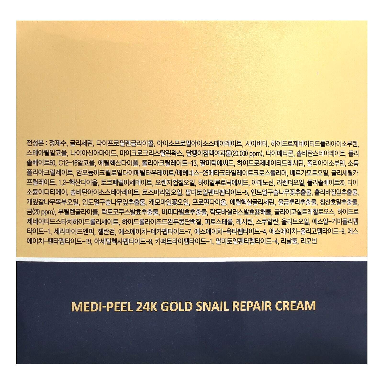 Вода, глицерин, дипропиленгликоль, изопропил изостеарат, масло ши (Butyrospermum parkii), гидрогенизированный полиизобутен, стеариловый спирт, никотинамид, микрокристаллический воск, фильтрат секрета улитки, диметикон, сорбитан стеарат, полисорбат 60, пальмитиновая кислота, этил гександиол, полисорбат 20, полиакрилат-13, c12-16 спирты, полиизобутен, полиакрилат натрия, аммоний акрилоилдиметилтаурата/бегенет-25 метакрилата кроссполимер, гидрогенизированный лецитин, масло бергамота (Citrus aurantium bergamia), глицерил каприлат, 1,2-гександиол, токоферилацетат, масло из цедры апельсина (Citrus aurantium dulcis), гиалуроновая кислота, аденозин, лавандовое масло (Lavandula angustifolia), двунатриевая ЭДТК, масло из листьев розмарина (Rosmarinus officinalis), пальмитоил пентапептид-5, экстракт цветков дерева ним (Melia azadirachta), экстракт листьев туласи (Ocimum sanctum), масло из древесины кедра (Cedrus deodara), экстракт листьев дерева ним (Melia azadirachta), масло цветков ромашки английской (Anthemis nobilis), этилгексилглицерин, экстракт корня куркумы (Curcuma longa), экстракт кораллины лекарственной (Corallina officinalis), золото, гидролизованный гороховый белок, лецитин, керамид NP, сквалан, оливковое масло (Olea europaea), фитостеролы, пропандиол, бутиленгликоль, экстракт продукта ферментации лактококка, экстракт продукта ферментации бифидобактерий, лизат продукта ферментации лактобактерий, гликозил трегалоза, гидролизат гидрогенизированного крахмала, sr-spider полипептид-1, геллановая камедь, sh-декапептид-7, sh-октапептид-4, sh-олигопептид-9, sh-пентапептид-19, ацетил гексапептид-8, меди трипептид-1, пальмитоил пентапептид-4.