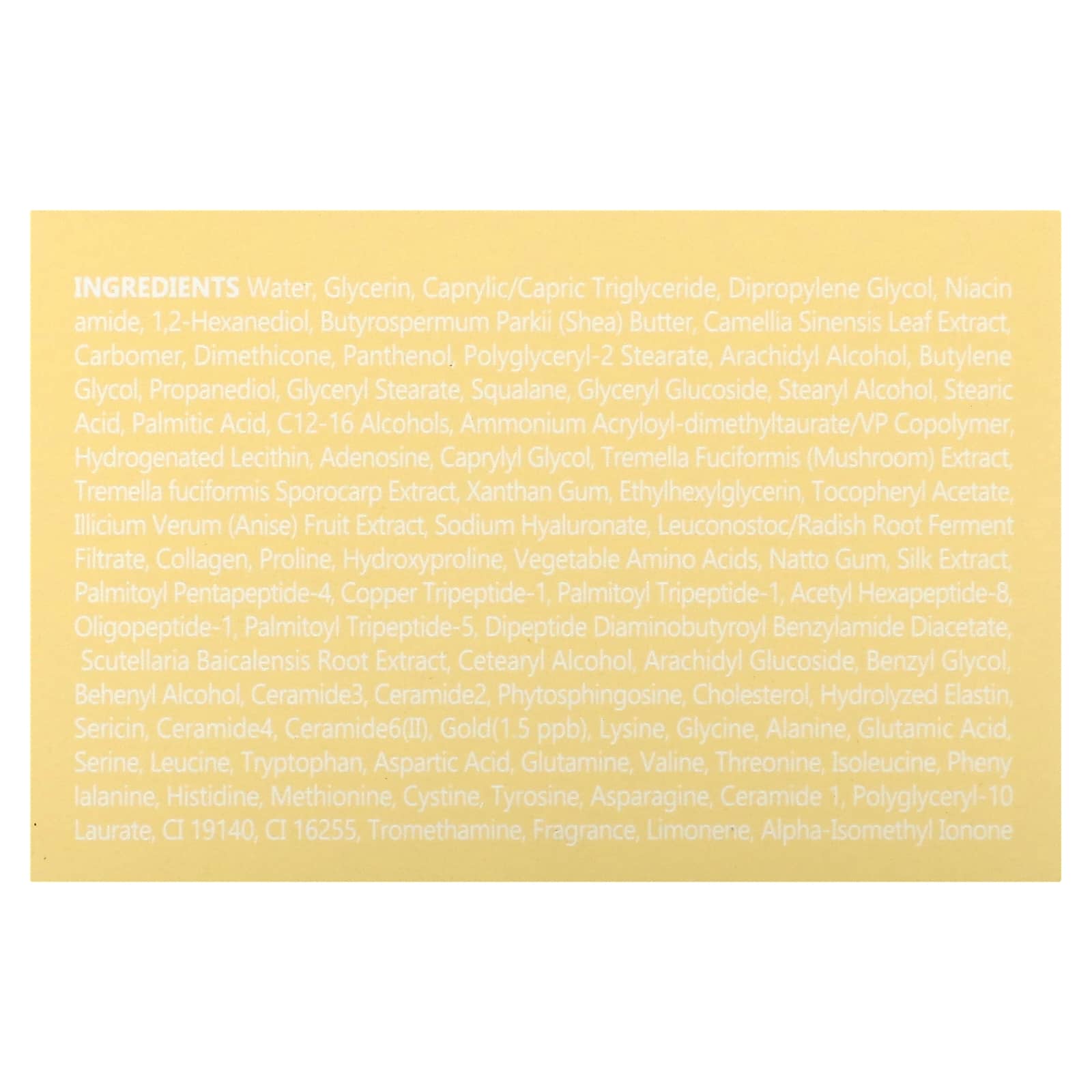 Вода, глицерин, каприловый/каприновый триглицерид, дипропиленгликоль, никотинамид, 1,2-гександиол, масло ши (Butyrospermum parkii), экстракт листьев зеленого чая (Camellia sinensis), карбомер, диметикон, пантенол, полиглицерил-2 стеарат, арахидиловый спирт, бутиленгликоль, пропандиол, глицерил стеарат, сквалан, глицерил глюкозид, стеариловый спирт, стеариновая кислота, пальмитиновая кислота, спирты c12-16, акрилоилдиметилтаурат аммония / ВП сополимер, гидрогенизированный лецитин, аденозин, каприлилгликоль, экстракт снежного гриба (Tremella fuciformis), экстракт спорокарпа грибов тремелла (Tremella fuciformis), ксантановая камедь, этилгексилглицерин, токоферилацетат, экстракт плодов аниса звездчатого (Illicium verum), гиалуронат натрия, лейконосток/ферментированный фильтрат корня редиса, коллаген, пролин, гидроксипролин, растительные аминокислоты, камедь натто, экстракт шелка, пальмитоил пентапептид-4, трипептид меди-1, пальмитоил трипептид-1, ацетил гексапептид-8 и олигопептид-1, пальмитоил трипептид-5, дипептид диаминобутироил бензиламид диацетат экстракт корня панциря (Scutellaria baicalensis), цетеариловый спирт, арахидиловый глюкозид, бензилгликоль, бегениловый спирт, керамид3, керамид2, фитосфингозин, холестерина, гидролизованный эластин, серицин, керамид4, керамид6 (II), золото (1,5 част. / млрд), лизин, глицин, аланин, серин глутаминовой кислоты, лейцин, триптофан, аспарагиновая кислота, глутамин, валин, треонин, изолейцин, фенилаланин, гистидин, метионина, цистин, тирозин, аспаргин, керамид 1, полиглицерил-10 лаурат, CI 19140, CI 16255, трометамин, отдушка, лимонен, альфа-изометилионон.