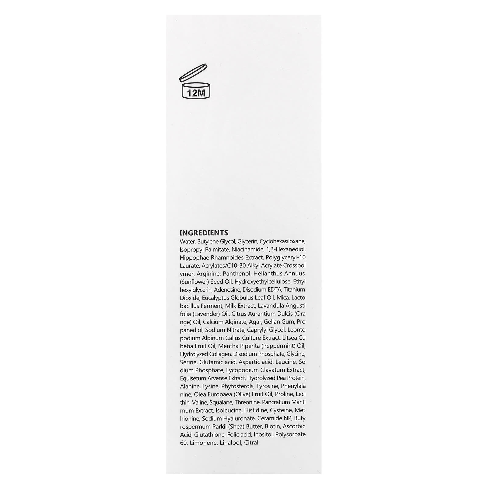 Вода, бутиленгликоль, глицерин, циклогексасилоксан, изопропилпальмитат, никотинамид, 1,2-гександиол, экстракт облепихи рамноидес, полиглицерил-10 лаурат, акрилат/c10-30 алкил акрилат кроссполимер, аргинин, пантенол, подсолнечное масло (Helianthus annuus), гидроксиэтилцеллюлоза, этилгексилглицерин, аденозин, двунатриевая ЭДТК, диоксид титана, масло из листьев эвкалипта шаровидного (Eucalyptus globulus), слюда, фермент Lacto молочнокислых бактерий, экстракт молока, лавандовое масло (Lavandula angustifolia), масло апельсина (Citrus aurantium dulcis), альгинат кальция, агар, геллановая камедь, пропандиол, нитрат натрия, каприлилгликоль, экстракт каллусной культуры эдельвейса (Leontopodium alpinum), масло плодов лицеи кубебы (Litsea cubeba), масло перечной мяты (Mentha piperita), гидролизованный коллаген, динатрия фосфат, глицин, серин, глутаминовая кислота, аспарагиновая кислота, лейцин, фосфат натрия, экстракт ликоподиума клаватума, экстракт хвоща полевого, гидролизованный ПЭА протеин, аланин, лизин, фитостеролы, тирозин, фенилаланин, оливковое масло (Olea europaea), пролин, лецитин, валин, сквалан, треонин, экстракт панкрация марити (Pancratium mariti mum), изолейцин, гистидин, цистеин, метионина, гиалуронат натрия, керамид NP, масло ши (Butyrospermum parkii), биотин, аскорбиновая кислота, глутатион, фолиевая кислота, инозитол, полисорбат 60, лимонен, линалоол, цитраль.