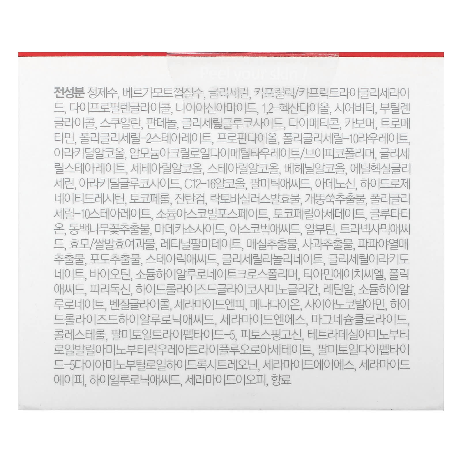 Очищенная вода, вода из цедры бергамота, глицерин, каприловый/каприновый триглицерид, дипропиленгликоль, никотинамид, 1,2-гександиол, масло ши, бутиленгликоль, сквалан, пантенол, глицерил глюкозид , диметикон, карбомер, трометамин, полиглицерил-2 стеарат, пропандиол, полиглицерил-10 лаурат, арахидиловый спирт, акрилоилдиметилтаурат / впикополимер аммония, глицерин лил стеарат, цетеариловый спирт, стеариловый спирт, бегениловый спирт, этилгексилглицерин, арахидиловый глюкозид, c12-16 спирт, пальмитиновая кислота, аденозин, гидрогенизированный лецитин, токоферол, ксантановая камедь, фермент лактобактерий (Lactobacillus) , экстракт полыни, полиглицерил-10 стеарат, аскорбил фосфат натрия, токоферилацетат, глутатион, экстракт цветков камелии, мадекассосид, аскорбиновая кислота, арбутин, транексамовая кислота, фильтрат ферментации дрожжей / риса , ретинилпальмитат, экстракт сливы, яблочный экстракт, экстракт плодов папайи, экстракт винограда, стеариновая кислота, глицерил линолинат, глицерил арахидонат, биотин, кроссполимер гиалуроната натрия, тиамина гидрохлорид, поликислота , пиридоксин, гидролизованный гликозаминогликан, ретиналь, гиалуронат натрия, бензилгликоль, керамид NP, менадион, цианокобаламин, гидролизованная гиалуроновая кислота, керамид NS, хлорид магния, холестерина, пальмитоил трипептид-5, фитосфингозин, тетрадециламинобутироилвалиламиномасляная мочевина трифторацетат, пальмитоил дипептид-5 диаминобутилоилгидрокситреонин , керамид ace, керамид АP, гиалуроновая кислота, керамид iop, отдушка.