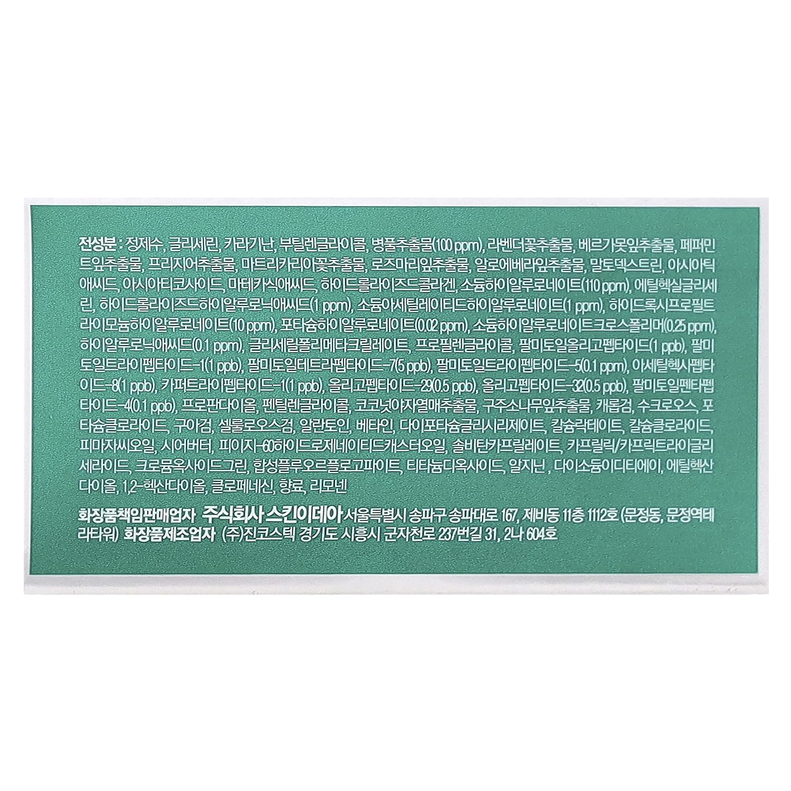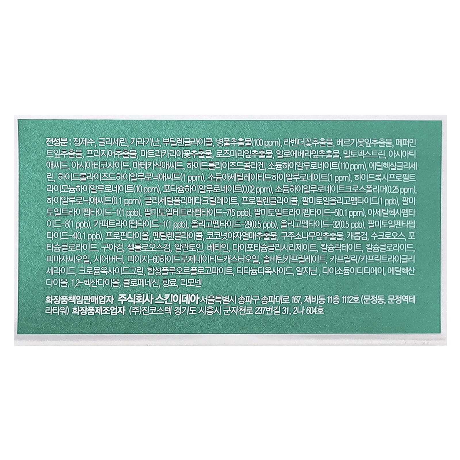 Вода, глицерин, каррагинан, бутиленгликоль, экстракт центеллы азиатской, экстракт цветков лаванды (Lavandula angustifolia), экстракт листьев монарды дидим (Monarda didyma), экстракт листьев перечной мяты (Mentha piperita), экстракт фрезии рефрактной, экстракт цветков ромашки (Chamomilla recutita), экстракт листьев розмарина (Rosmarinus officinalis), экстракт листьев алоэ вера, мальтодекстрин, азиатская кислота, азиатикозид, мадекассовая кислота, гидролизованный коллаген, гиалуронат натрия, этилгексилглицерин, гидролизованная гиалуроновая кислота, ацетилированный гиалуронат натрия, гидроксипропилтримония гиалуронат, гиалуронат калия, кроссполимер гиалуроната натрия, гиалуроновая кислота, глицерил полиметакрилат, пропиленгликоль, пальмитоил олигопептид, пальмитоил трипептид-1, пальмитоил тетрапептид-7, пальмитоил трипептид-5, ацетил гексапептид-8, трипептид меди-1, oligopeptide-29, oligopeptide-32, пальмитоил пентапептид-4, пропандиол, пентиленгликоль, экстракт плодов кокоса (Cocos nucifera), экстракт листьев сосны обыкновенной (Pinus sylvestris), камедь рожкового дерева (Ceratonia siliqua), сахароза, хлорид калия, гуаровая камедь (Cyamopsis tetragonoloba), целлюлозная камедь, аллантоин, бетаин, дикалия глицирризат, лактат кальция, хлорид кальция, касторовое масло (ricinus communis), масло ши (Butyrospermum parkii), ПЭГ-60 гидрогенизированное касторовое масло, сорбитан каприлат, каприловый / каприновый триглицерид, зелень с оксидом хрома, синтетический фторфлогопит, диоксид титана, аргинин, двунатриевая ЭДТК, этил гександиол, 1,2-гександиол, хлорфенезин, аромат.