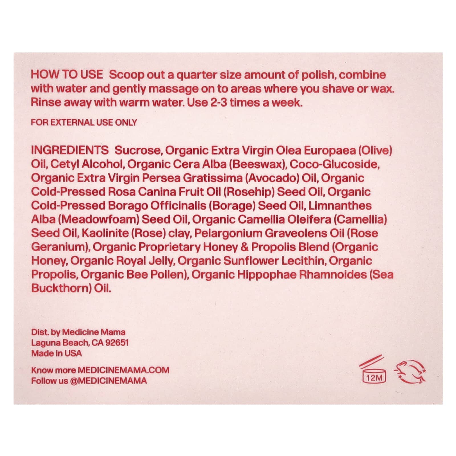 сахароза, органическое оливковое масло холодного отжима, цетиловый спирт, органический пчелиный воск (Cera alba), кокоглюкозид, органическое масло авокадо (Persea gratissima) первого отжима, органическое масло из плодов шиповника (Rosa canina) холодного отжима, органическое масло семян бурачника (Borago officinalis) холодного отжима, масло из семян пенника лугового (Limnanthes alba), органическое масло семян камелии масличной (Camellia oleifera), каолинит (розовая) глина, масло герани (Pelargonium graveolens), органический запатентованный мед и смесь прополиса (органический мед, органическое маточное молочко, органический подсолнечный лецитин, органический прополис, органическая пчелиная пыльца), органическое масло облепихи (Hippophae rhamnoides).