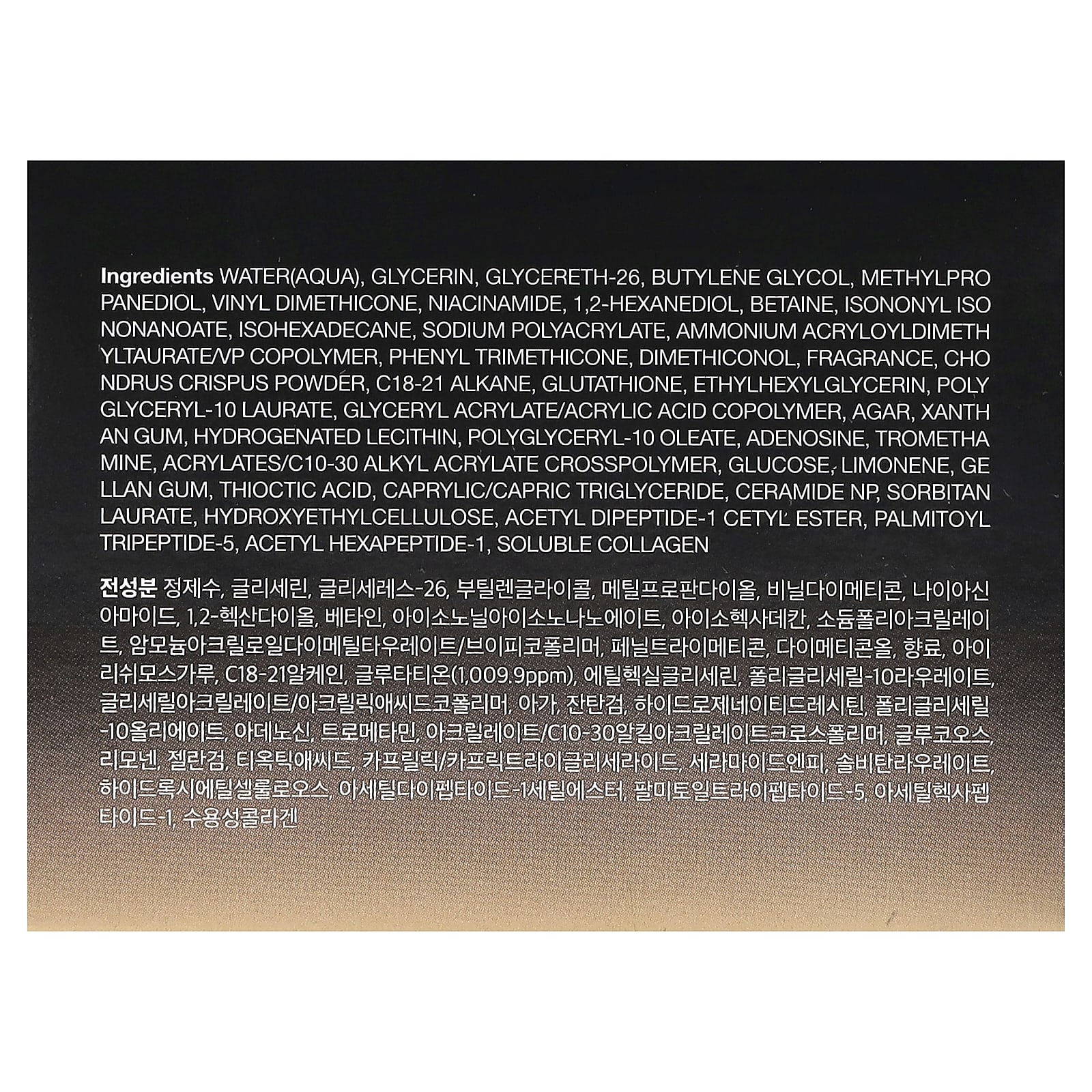 Вода (Aqua), глицерин, глицерет-26, бутиленгликоль, метилпропандиол, винил диметикон, никотинамид, 1,2-гександиол, бетаин, изононил изононаноат, изогексадекан, полиакрилат натрия, аммоний акрилоилдиметилтаурат/ВП сополимер, фенилтриметикон, диметиконол, отдушка, порошок из ирландского мха (Chondrus crispus), c18-21 алкан, глутатион, этилгексилглицерин, полиглицерил-10 лаурат, сополимер глицерил акрилата/акриловой кислоты, агар, ксантановая камедь, гидрогенизированный лецитин, полиглицерил-10 олеат, аденозин, трометамин, акрилат/c10-30 алкил акрилат кроссполимер, глюкоза, лимонен, геллановая камедь, тиоктовая кислота, каприловый/каприновый триглицерид, керамид NP, сорбитан лаурат, гидроксиэтилцеллюлоза, цетиловый эфир ацетил дипептида-1, пальмитоил трипептид-5, ацетил гексапептид-1, растворимый коллаген.