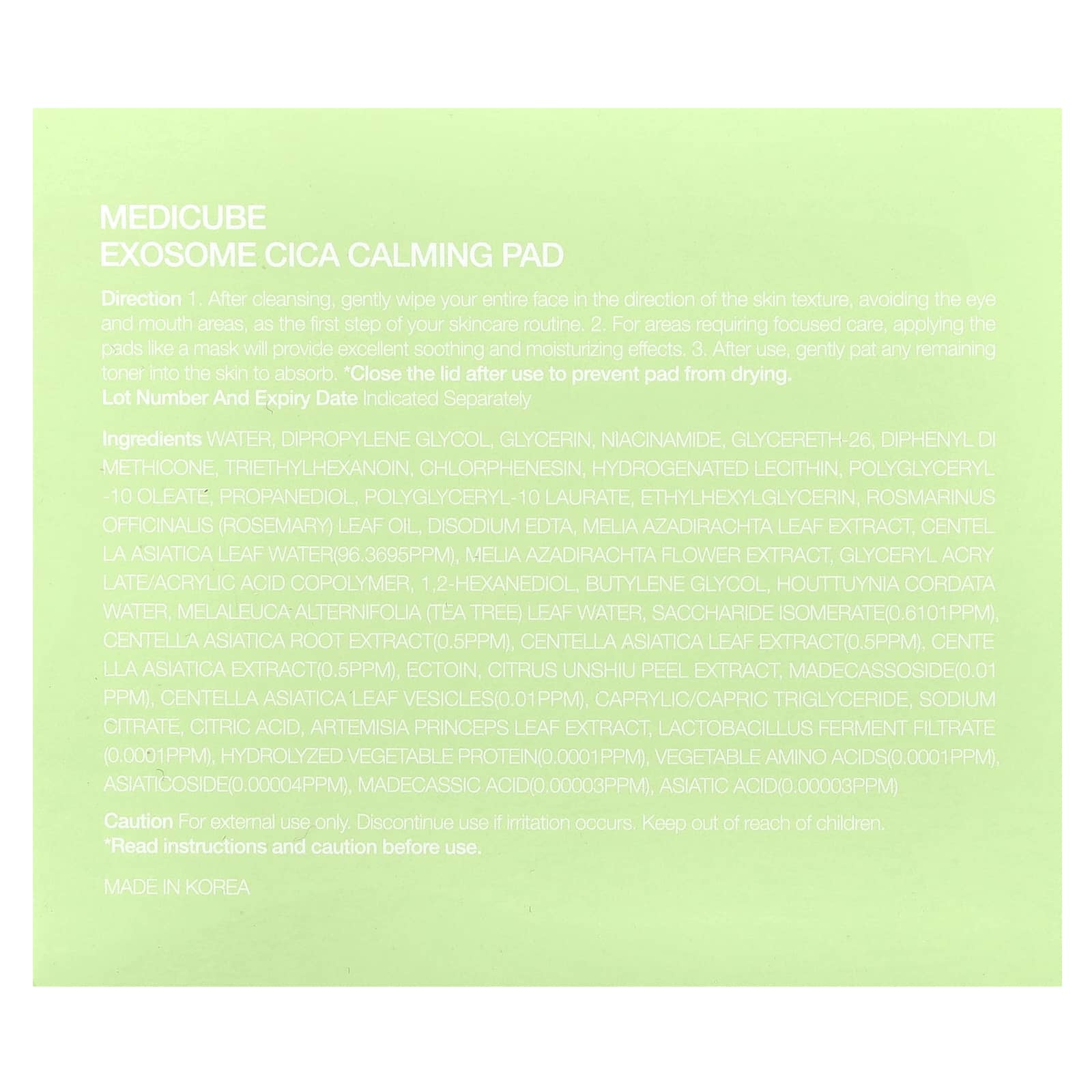 Вода, дипропиленгликоль, глицерин, никотинамид, глицерет-26, дифенил ди метикон, триэтилгексаноин, хлорфенезин, гидрогенизированный лецитин, полиглицерил-10 олеат, пропандиол, полиглицерил-10 лаурат, этилгексилглицерин, масло из листьев розмарина (Rosmarinus officinalis), двунатриевая ЭДТК, экстракт листьев дерева ним (Melia azadirachta), вода из листьев центеллы азиатской (96,3695 част. / млн), экстракт цветков дерева ним (Melia azadirachta), сополимер глицерил акрилата/акриловой кислоты, 1,2-гександиол, бутиленгликоль, Houttuynia cordata, вода, вода из листьев чайного дерева (Melaleuca alternifolia), изомерат сахарида (0,6101 част. / млн), экстракт корня центеллы азиатской (0,5 част. / млн), экстракт листьев центеллы азиатской (0,5 част. / млн), экстракт центеллы азиатской (0,5 част. / млн), эктоин, экстракт цедры мандарина уншиу (Citrus unshiu), мадекассосид (0,01 част. / млн), пузырьки листьев центеллы азиатской (0,01 част. / млн), каприловый/каприновый триглицерид, цитрат натрия, лимонная кислота, экстракт листьев полыни корейской (Artemisia princeps), фильтрат фермента лактобактерий (0,0001 част. / млн), гидролизованный растительный белок (0,0001 част. / млн), растительные аминокислоты (0,0001 част. / млн), азиатикозид (0,00004 част. / млн), мадекассовая кислота (0,00003 част. / млн), азиатиковая кислота (0,00003 част. / млн).