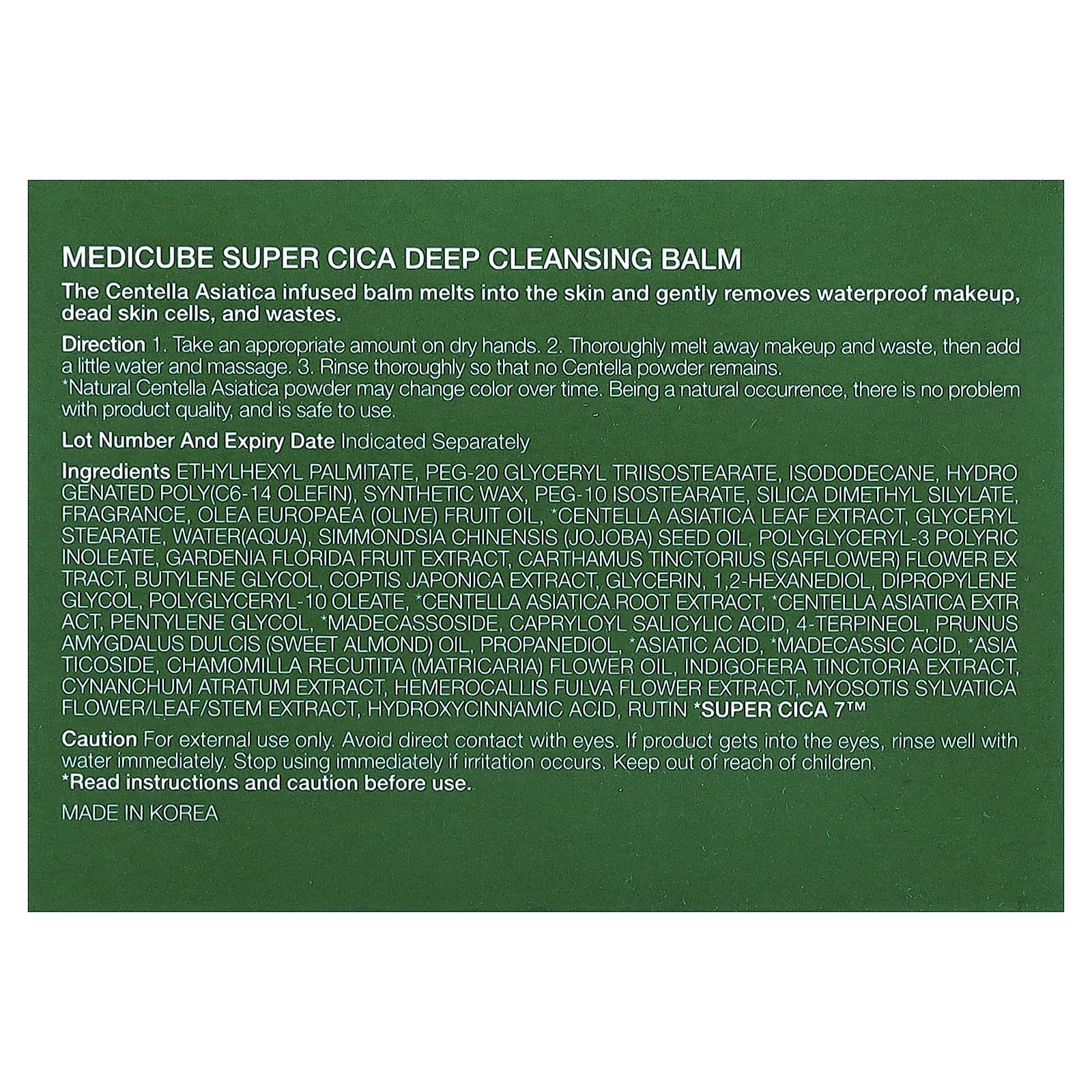 Этилгексил пальмитат, ПЭГ-20 глицерил триизостеарат, изододекан, гидрогенизированный поли (C6-14 олефин), синтетический воск, ПЭГ-10 изостеарат, диметил силилат диоксида кремния, отдушка, оливковое масло (Olea europaea), экстракт листьев готу колы (Centella asiatica)*, глицерил стеарат, вода, масло из семян жожоба (Simmondsia chinensis), полиглицерил-3-полирицинолеат, экстракт плодов гардении жасминовидной (Gardenia florida), экстракт цветков сафлора (Carthamus tinctorius), бутиленгликоль, экстракт сверции японской (Swertia japonica), глицерин, 1,2-гександиол, дипропиленгликоль, полиглицерил-10 олеат, экстракт корня готу колы (Centella asiatica)*, экстракт готу колы (Centella asiatica)*, пентилен гликоль, мадекассосид*, каприлоил салициловой кислоты, 4-терпинеол, масло сладкого миндаля (Prunus amygdalus dulcis), пропандиол, азиатская кислота*, мадекассовая кислота*, азиатикозид*, масло из цветков ромашки лекарственной (Chamomilla recutita), экстракт чаги (Indigofera tinctoria), экстракт цинанхума (Cynanchum atratum), экстракт цветков горца многоцветкового (Hemerocallis fulva), экстракт цветков, листьев и стеблей гриба лесного (Myosotis sylbatica), гидроксикоричная кислота, рутин.