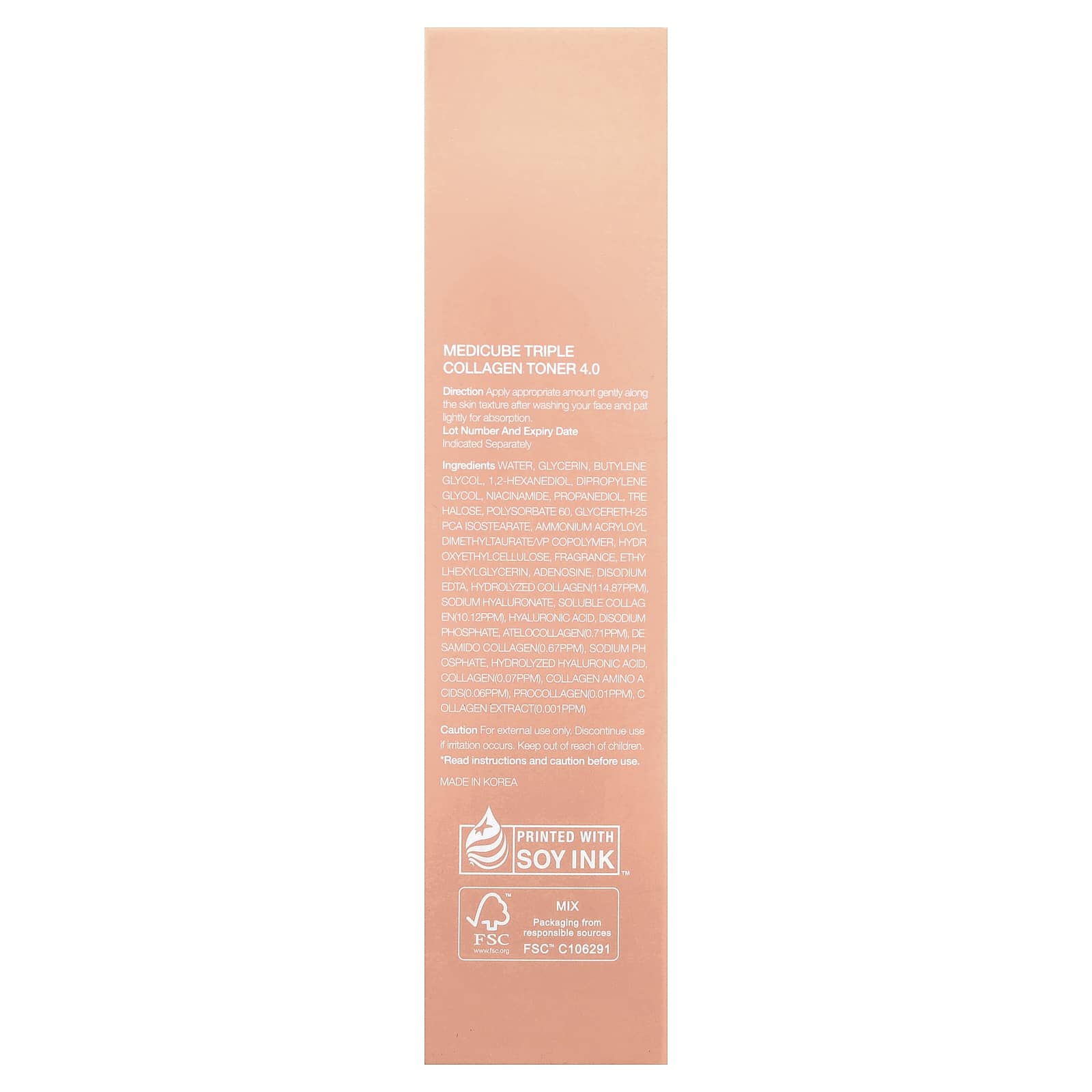 Вода, глицерин, бутиленгликоль, 1,2-гександиол, дипропиленгликоль, никотинамид, пропандиол, трегалоза, полисорбат 60, глицерет-25 пирролидонкарбонат, аммоний акрилоил диметилтаурат/ВП сополимер, гидроксиэтилцеллюлоза, отдушка, этилгексилглицерин, аденозин, двунатриевая ЭДТК, гидролизованный коллаген (114,87 част./млн), гиалуронат натрия, растворимый коллаген (10,12 част./млн), гиалуроновая кислота, динатрия фосфат, ателоколлаген (0,71 част./млн), дезамидоколлаген (0,67 част./млн), фосфат натрия, гидролизованная гиалуроновая кислота, коллаген (0,07 част./млн), аминокислоты коллагена (0,06 част./млн), проколлаген (0,01 част./млн), экстракт коллагена (0,001 част./млн).