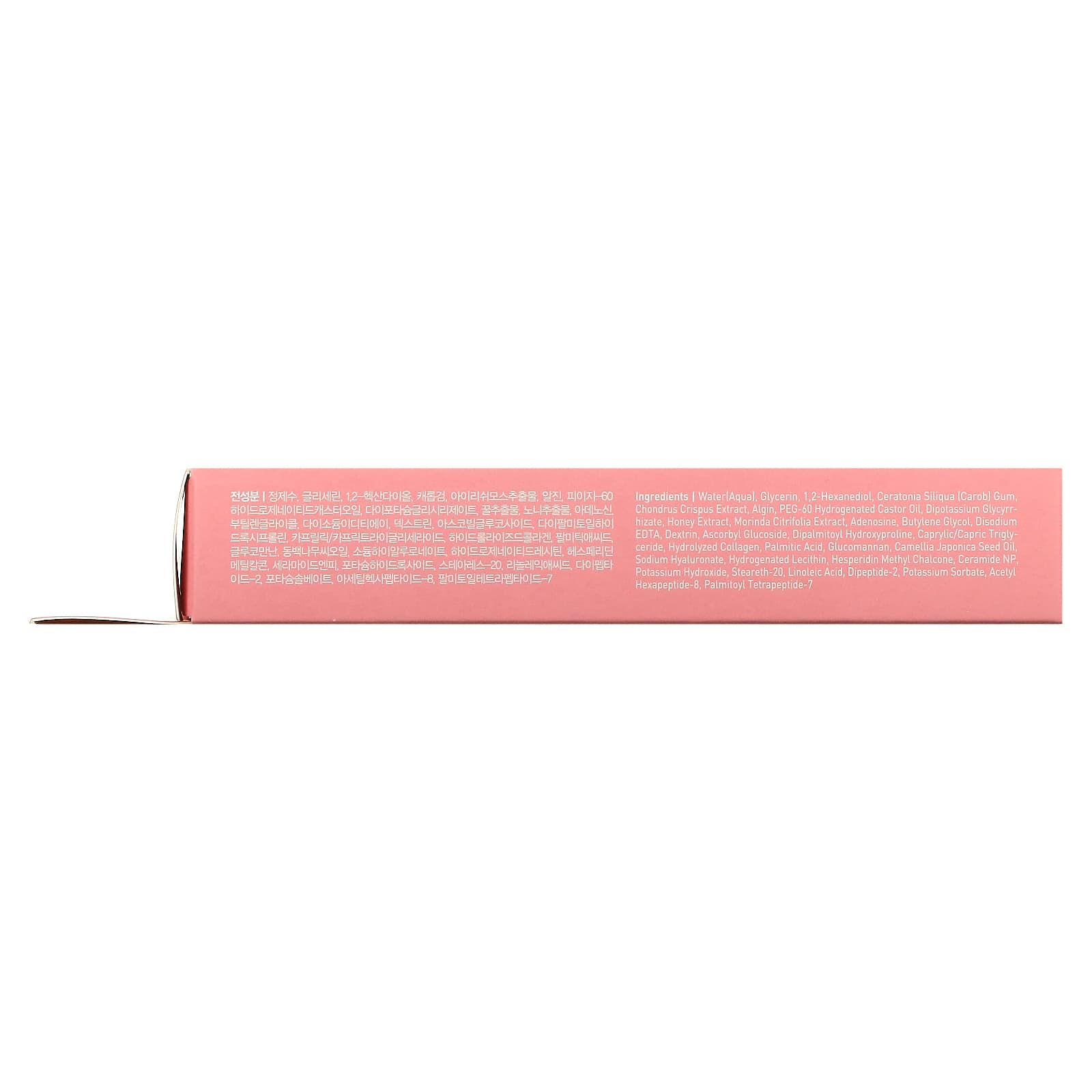 Вода, глицерин, 1,2-гександиол, камедь рожкового дерева (Ceratonia siliqua), экстракт ирландского мха (Chondrus crispus), альгин, ПЭГ-60 гидрогенизированное касторовое масло, дикалия глицирризат, экстракт меда, экстракт моринды лимонной (Morinda citrifolia), аденозин, бутиленгликоль, двунатриевая ЭДТК, декстрин, аскорбил глюкозид, дипальмитоил гидроксипролин, каприловый/каприновый триглицерид, гидролизованный коллаген, пальмитиновая кислота, глюкоманнан, масло из семян камелии японской (Camellia japonica), гиалуронат натрия, гидрогенизированный лецитин, гесперидин метил халькон, керамид NP, гидроксид калия, стеарет-20, линолевая кислота, дипептид-2, сорбат калия, ацетил гексапептид-8, пальмитоил тетрапептид-7.
