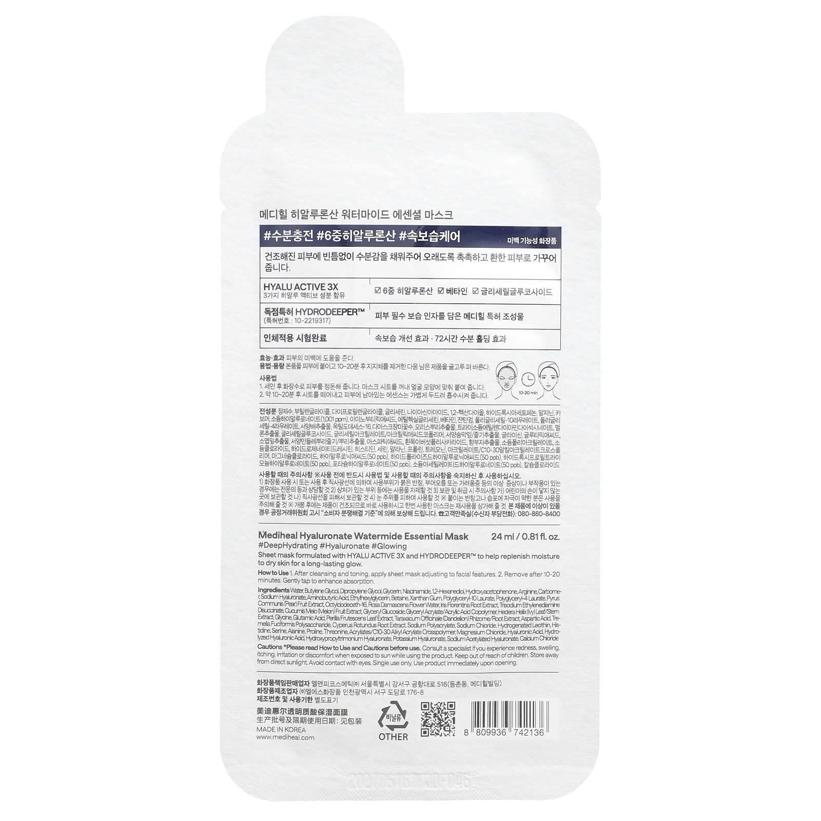 MEDIHEAL, Маска для красоты с гиалуронатом и водой, 1 шт., 24 мл (0,81 жидк. Унции)