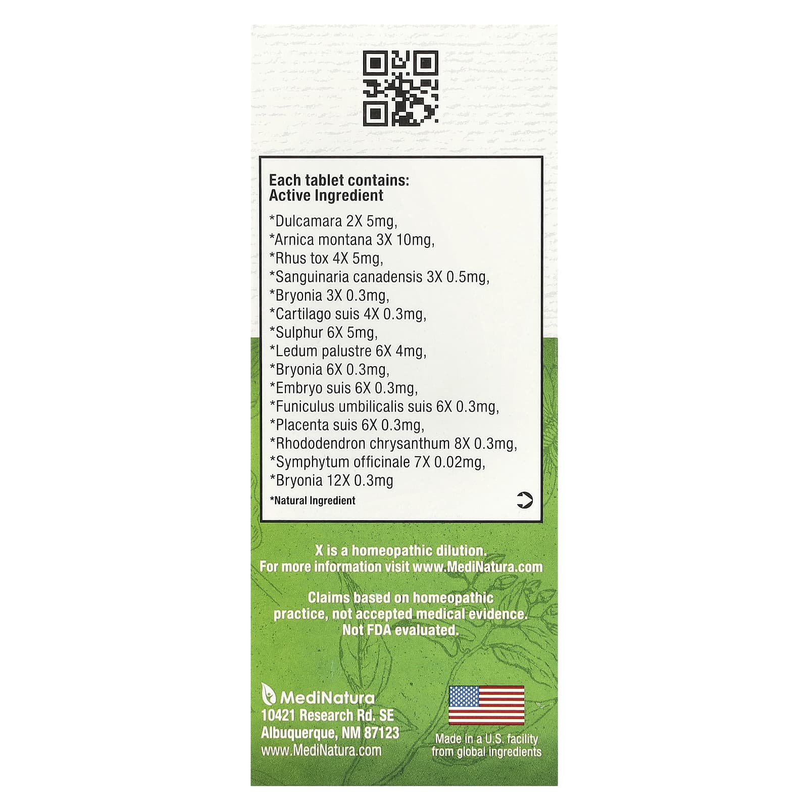 | дулькамара (Dulcamara) 2X 5 мг, арника (Arnica montana) 3X 10 мг, * рух токс (Rhus tox) 4X 5 мг, сангвинария канадская (Sanguinaria canadensis) 3X 0,5 мг, бриония (Bryonia) 3X 0,3 мг, хрящ (Cartilago suis) 4X 0,3 мг, * сера 6X 5 мг, * багряник (Ledum palustre) 6X 4 мг, бриония* 6X 0,3 мг, * embryo suis 6X 0,3 мг, фукус пупочный (Funiculus umbilicalis suis) 6X 0,3 мг, плацента 6X 0,3 мг*, рододендрон хризантемный (Rhododendron chrysanthum) 8X 0,3 мг, симфитум лекарственный (Symphytum officinale) 7X 0,02 мг, бриония* 12X 0,3 мг . |