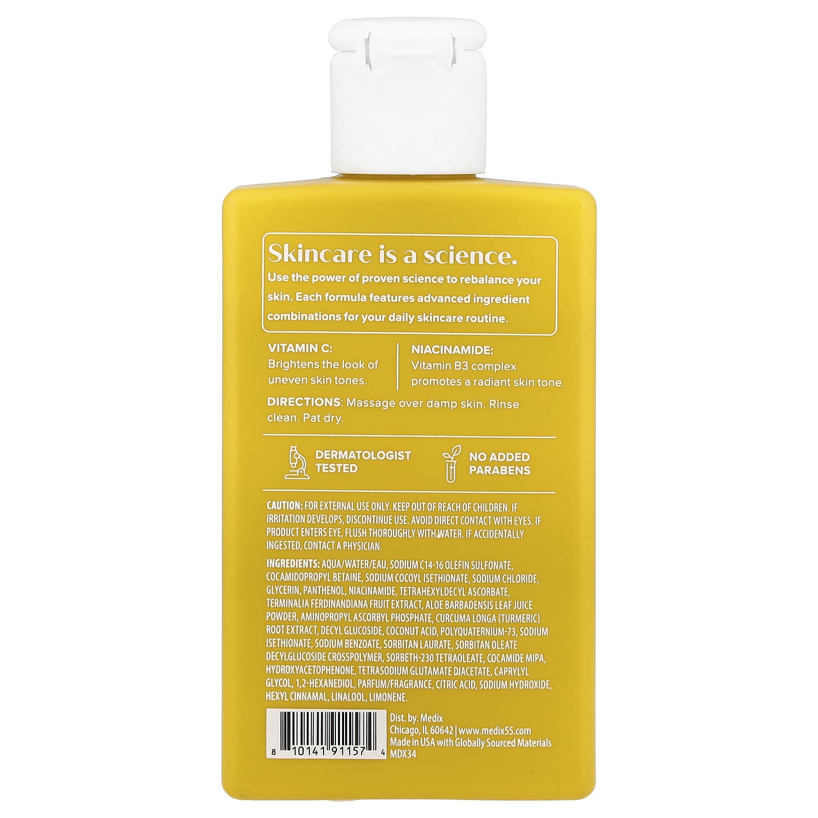 Вода, натрия С14-16 олефин сульфонат, кокамидопропилбетаин, кокоил изетионат натрия, хлорид натрия, глицерин, пантенол, никотинамид, тетрагексилдецил аскорбат, экстракт плодов сливы какаду (Terminalia ferdinandiana), порошок из сока листьев алоэ вера (Aloe barbadensis), аминопропил аскорбилфосфат, экстракт корня куркумы (Curcuma longa), децил глюкозид, кокосовая кислота, поликватерниум-73, изетионат натрия, бензоат натрия, сорбитан лаурат, децилглюкозид сорбитанолеата кроссполимер, сорбет-230 тетраолеат, кокамид моноизопропаноламина, гидроксиацетофенон, диацетат глутамата тетранатрия, каприлилгликоль, 1,2-гександиол, парфюмерная композиция/отдушка, лимонная кислота, гидроксид натрия, гексил циннамал, линалоол, лимонен.