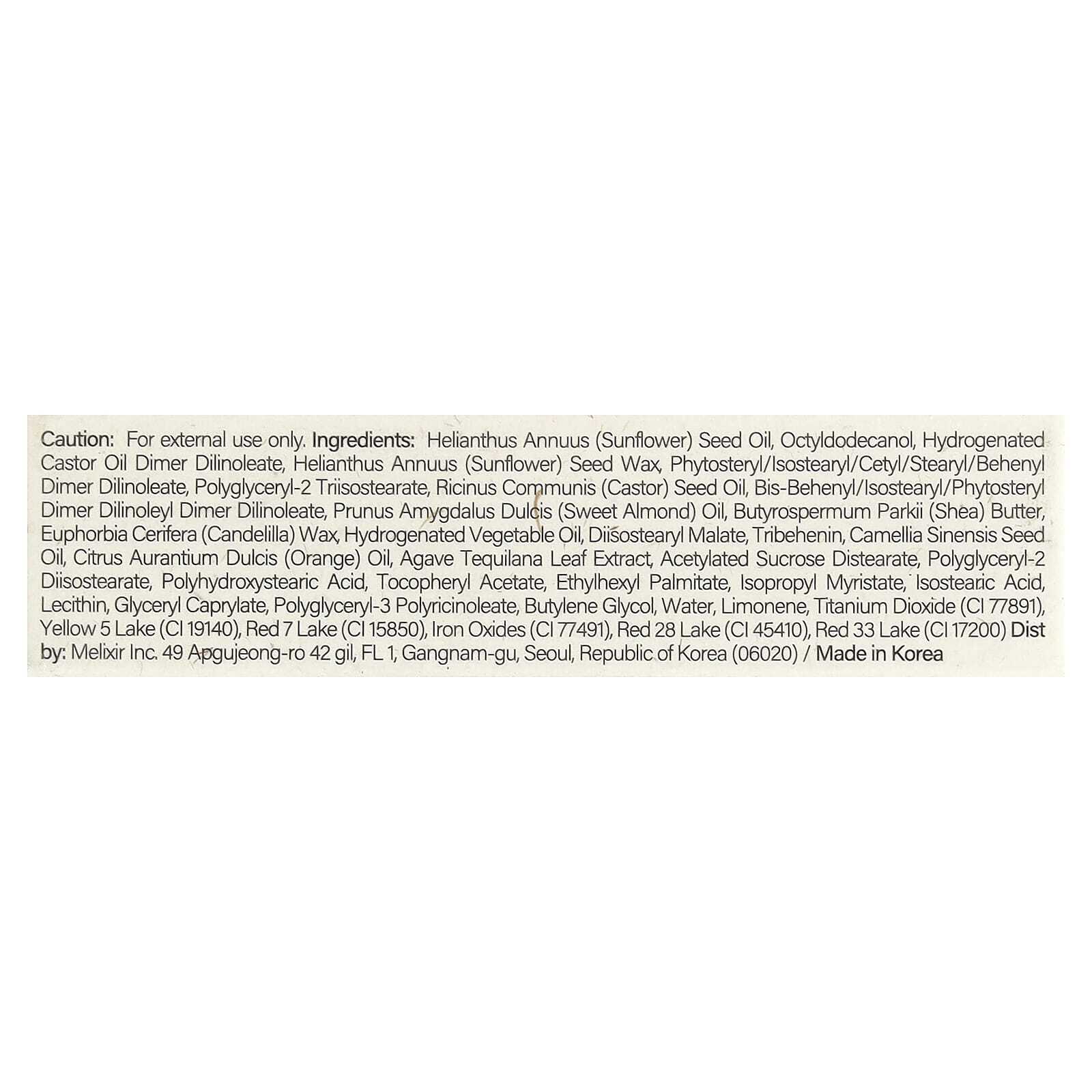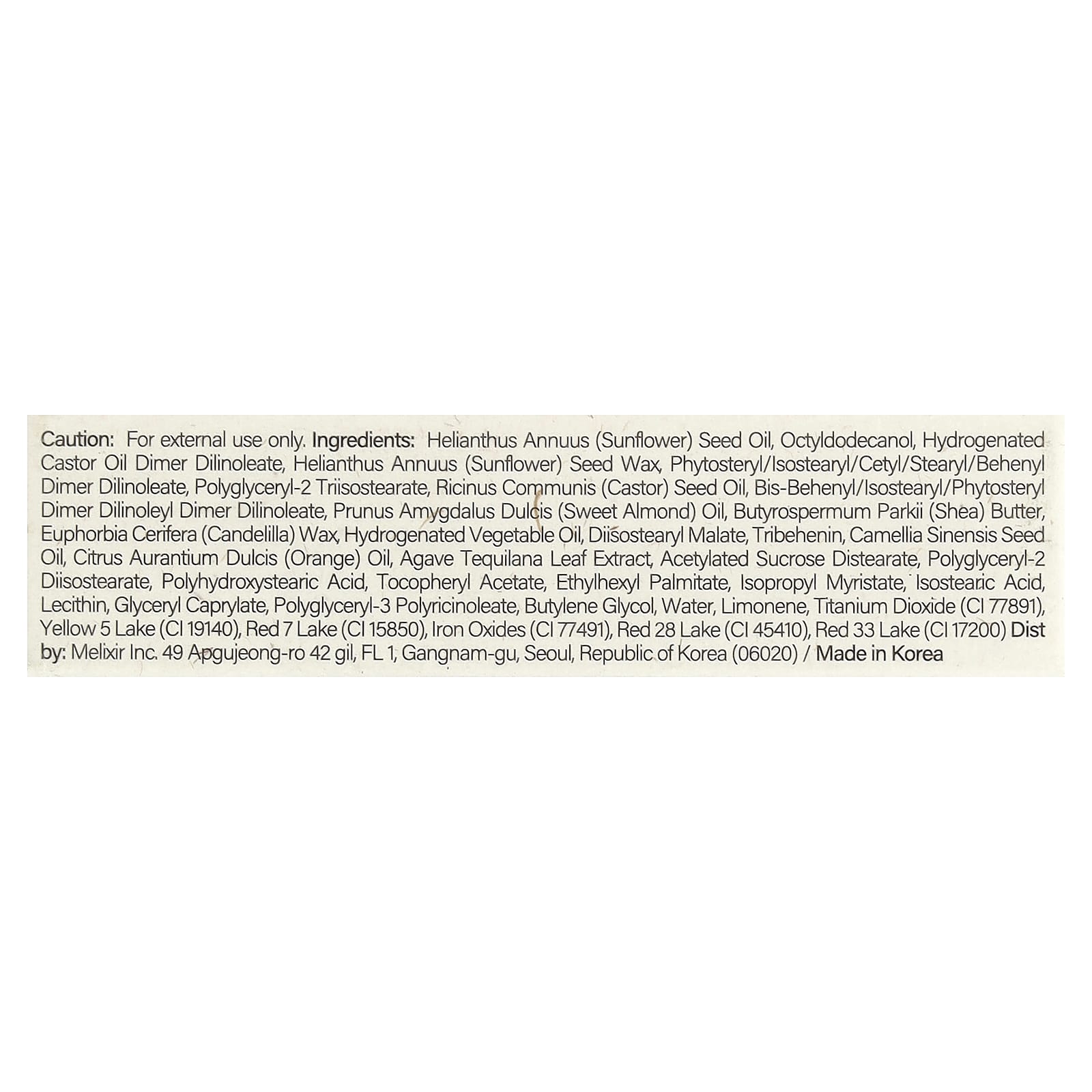 Подсолнечное масло (Helianthus annuus), октилдодеканол, димер дилинолеат гидрогенизированного касторового масла, воск из семян подсолнечника (Helianthus annuus), фитостерил / изостеарил / цетил / стеарил / бегенил димер дилинолеат, полиглицерил-2 триизостеарат, касторовое масло (Ricinus communis), бис-бегенил/изостеарил/фитостерил димер дилинолеил димер дилинолеат, масло сладкого миндаля (Prunus amygdalus dulcis), масло ши (Butyrospermum parkii), канделильский воск (Euphorbia cerifera), гидрогенизированное растительное масло, диизостеарил малат, трибехенин, масло из семян зеленого чая (Camellia sinensis), масло апельсина (Citrus aurantium dulcis), экстракт листьев голубой агавы (Agave tequilana), ацетилированный дистеарат сахарозы, полиглицерил-2 диизостеарат, полигидроксистеариновая кислота, токоферилацетат, этилгексил пальмитат, изопропил миристат, изостеариновая кислота, лецитин, глицерил каприлат, полиглицерил-3-полирицинолеат, бутиленгликоль, вода, лимонен, диоксид титана (CI 77891), краситель жёлтый 5 лак (CI 19140), краситель красный 7 лак (CI 15850), оксиды железа (CI 77491), краситель красный 28 лак (CI 45410), краситель красный 33 лак (CI 17200).