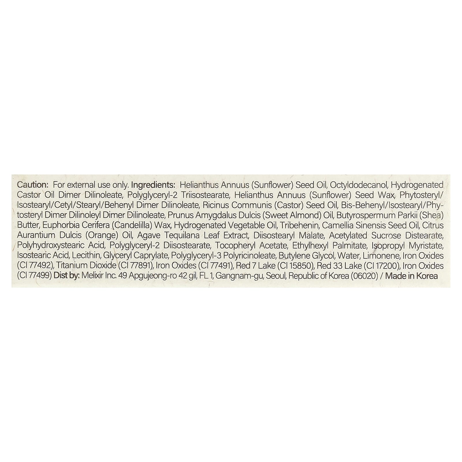 Подсолнечное масло (Helianthus annuus), октилдодеканол, димер дилинолеат гидрогенизированного касторового масла, полиглицерил-2 триизостеарат, воск из семян подсолнечника (Helianthus annuus), фитостерил/изостеарил/цетил/стеарил/бегенил димер дилинолеат, касторовое масло (Ricinus communis), бис-бегенил/изостеарил/фитостерил димер дилинолеил димер дилинолеат, масло сладкого миндаля (Prunus amygdalus dulcis), масло ши (Butyrospermum parkii), канделильский воск (Euphorbia cerifera), гидрогенизированное растительное масло, трибехенин, масло из семян зеленого чая (Camellia sinensis), масло апельсина (Citrus aurantium dulcis), экстракт листьев голубой агавы (Agave tequilana), диизостеарил малат, ацетилированный дистеарат сахарозы, полигидроксистеариновая кислота, полиглицерил-2 диизостеарат, токоферилацетат, этилгексил пальмитат, изопропил миристат, изостеариновая кислота, лецитин, глицерил каприлат, полиглицерил-3-полирицинолеат, бутиленгликоль, вода, лимонен, оксиды железа (CI 77492), диоксид титана (CI 77891), оксиды железа (CI 77491), краситель красный 7 лак (CI 15850), краситель красный 33 лак (CI 17200), оксиды железа (CI 77499).