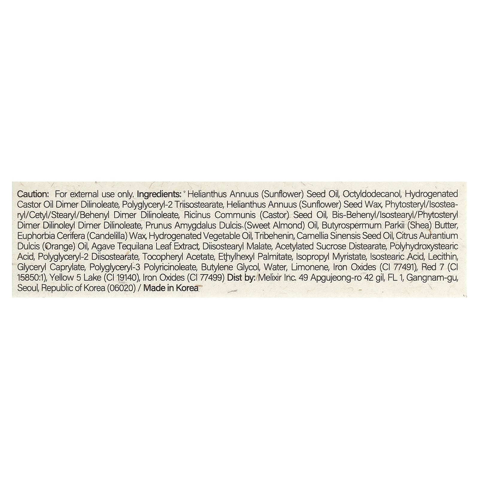 Подсолнечное масло (Helianthus annuus), октилдодеканол, димер дилинолеат гидрогенизированного касторового масла, полиглицерил-2 триизостеарат, воск из семян подсолнечника (Helianthus annuus), фитостерил / изостеарил / цетил / стеарил / бегенил димер дилинолеат, касторовое масло (Ricinus communis), бис-бегенил/изостеарил/фитостерил димер дилинолеил димер дилинолеат, масло сладкого миндаля (Prunus amygdalus dulcis), масло ши (Butyrospermum parkii), канделильский воск (Euphorbia cerifera), гидрогенизированное растительное масло, трибехенин, масло из семян зеленого чая (Camellia sinensis), масло апельсина (Citrus aurantium dulcis), экстракт листьев голубой агавы (Agave tequilana), диизостеарил малат, ацетилированный дистеарат сахарозы, полигидроксистеариновая кислота, полиглицерил-2 диизостеарат, токоферилацетат, этилгексил пальмитат, изопропил миристат, изостеариновая кислота, лецитин, глицерил каприлат, полиглицерил-3-полирицинолеат, бутиленгликоль, вода, лимонен, оксиды железа (CI 77491), краситель красный 7 (CI 15850:1), краситель жёлтый 5 лак (CI 19140), оксиды железа (CI 77499).