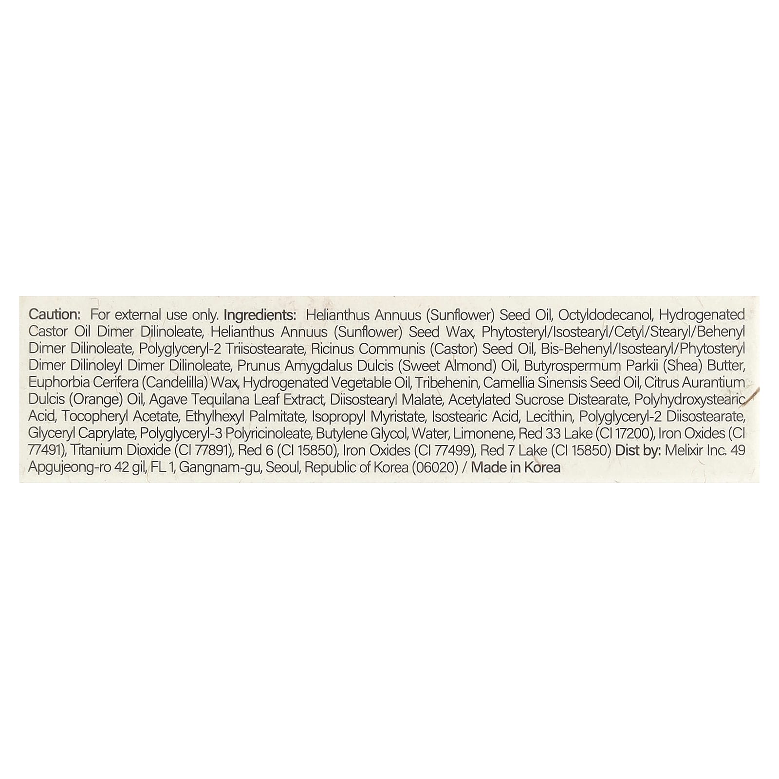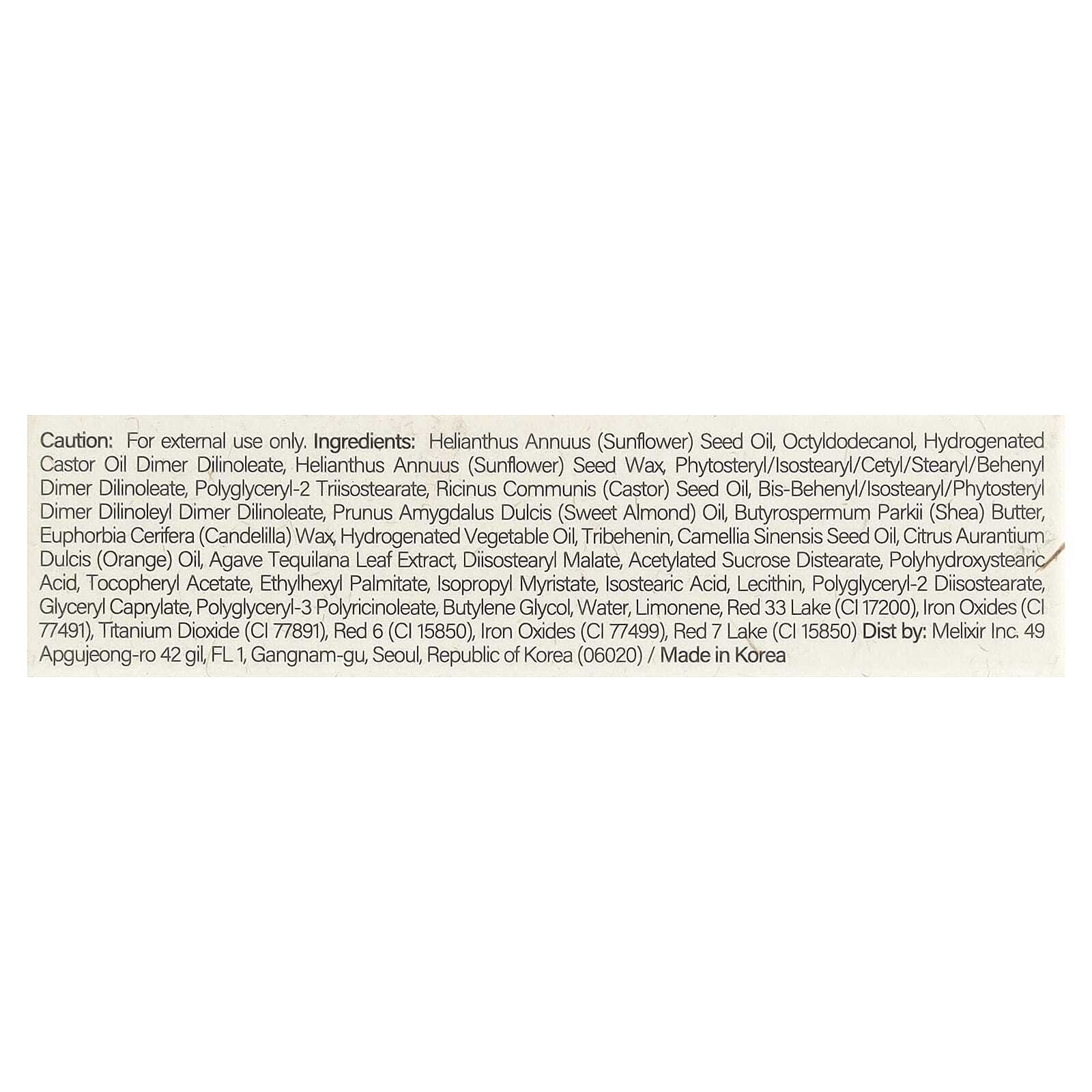 Подсолнечное масло (Helianthus annuus), октилдодеканол, димер дилинолеат гидрогенизированного касторового масла, воск из семян подсолнечника (Helianthus annuus), фитостерил / изостеарил / цетил / стеарил / бегенил димер дилинолеат, полиглицерил-2 триизостеарат, касторовое масло (Ricinus communis), бис-бегенил/изостеарил/фитостерил димер дилинолеил димер дилинолеат, масло сладкого миндаля (Prunus amygdalus dulcis), масло ши (Butyrospermum parkii), канделильский воск (Euphorbia cerifera), гидрогенизированное растительное масло, трибехенин, масло из семян зеленого чая (Camellia sinensis), масло апельсина (Citrus aurantium dulcis), экстракт листьев голубой агавы (Agave tequilana), диизостеарил малат, ацетилированный дистеарат сахарозы, полигидроксистеариновая кислота, токоферилацетат, этилгексил пальмитат, изопропил миристат, изостеариновая кислота, лецитин, полиглицерил-2 диизостеарат, глицерил каприлат, полиглицерил-3-полирицинолеат, бутиленгликоль, вода, лимонен, краситель красный 33 лак (CI 17200), оксиды железа (CI 77491), диоксид титана (CI 77891), краситель красный 6 (CI 15850), оксиды железа (CI 77499), краситель красный 7 лак (CI 15850).