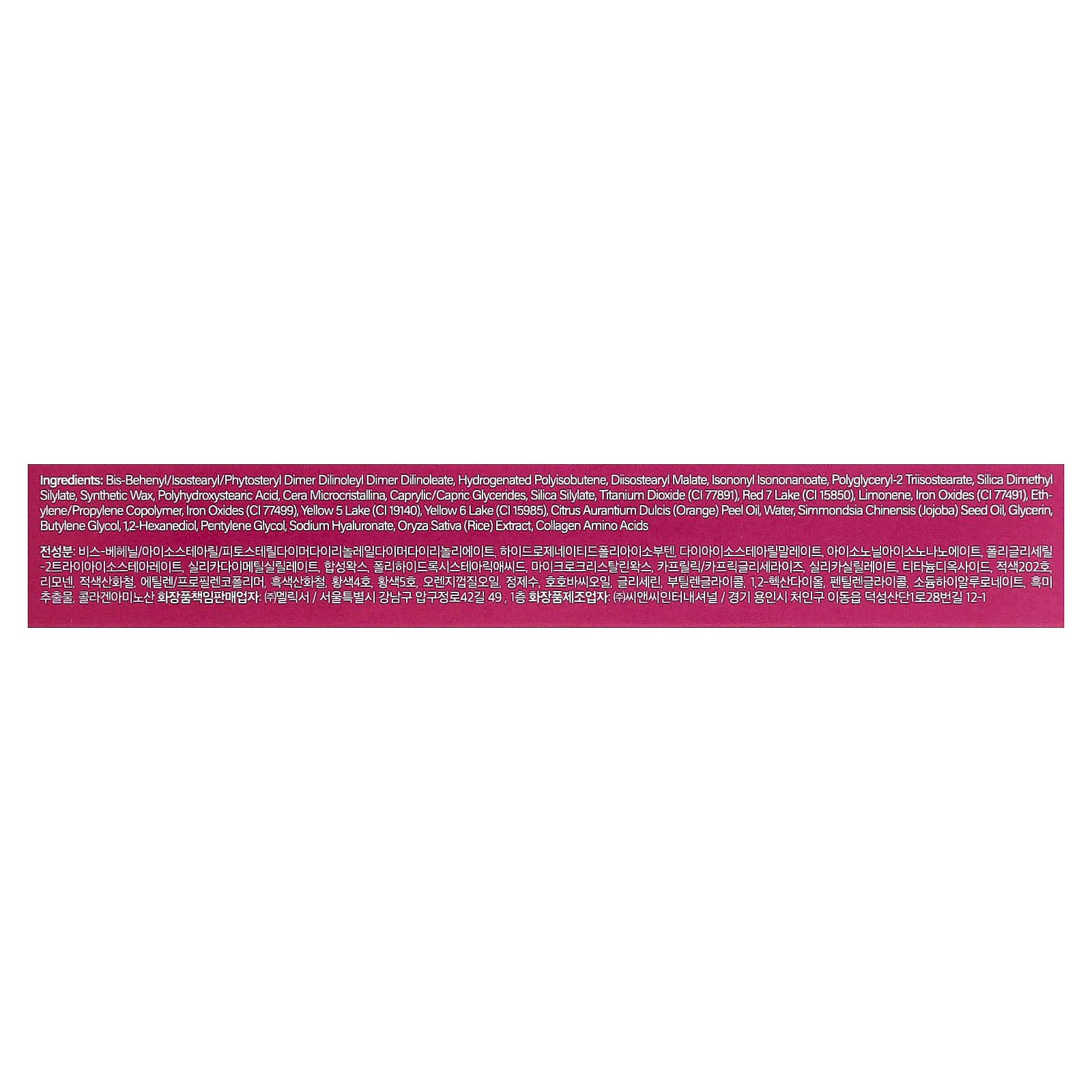 Бис-бегенил/изостеарил/фитостерил димер дилинолеил димер дилинолеат, гидрогенизированный полиизобутен, диизостеарил малат, изононил изононаноат, полиглицерил-2 триизостеарат, диметил силилат диоксида кремния, синтетический воск, полигидроксистеариновая кислота, микрокристаллический воск, каприловые/каприновые глицериды, силилат диоксида кремния, диоксид титана (CI 77891), краситель красный 7 лак (CI 15850), лимонен, оксиды железа (CI 77491), сополимер этилена/пропилена, оксиды железа (CI 77499), краситель жёлтый 5 лак (CI 19140), краситель желтый 6 лак (CI 15985), масло из цедры апельсина (Citrus aurantium dulcis), вода, масло из семян жожоба (Simmondsia chinensis), глицерин, бутиленгликоль, 1,2-гександиол, пентилен гликоль, гиалуронат натрия, экстракт риса (Oryza sativa), коллагеновые аминокислоты.