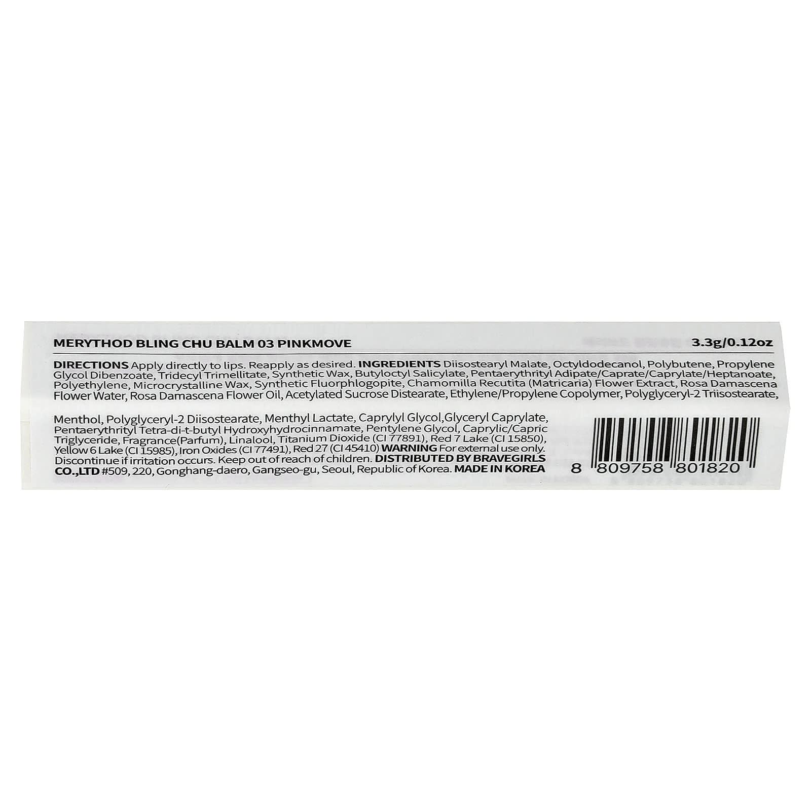 Диизостеарил малат, октилдодеканол, полибутен, пропиленгликоль дибензоат, тридецилтримеллитат, синтетический воск, бутилоктилсалицилат, пентаэритритил адипат/капрат/каприлат/гептаноат, полиэтилен, микрокристаллический воск, синтетический флурфлогопит, Chamomilla recutita (Matricaria) Экстракт цветков, вода из цветков дамасской розы (Rosa damascena), масло из цветков дамасской розы (Rosa damascena), ацетилированный дистеарат сахарозы, сополимер этилена/пропилена, полиглицерил-2 триизостеарат, ментол, полиглицерил-2 диизостеарат, ментил лактат, каприлилгликоль, глицерил каприлат, пентаэритритил тетра-ди-т-бутилгидроксициннамат, пентиленгликоль, каприловый/каприновый триглицерид, Ароматизатор (парфюм), линалоол, Диоксид титана (CI 77891), краситель красный 7 лак (CI 15850), краситель желтый 6 лак (CI 15985), оксиды железа (CI 77491), краситель красный 27 (CI 45410).