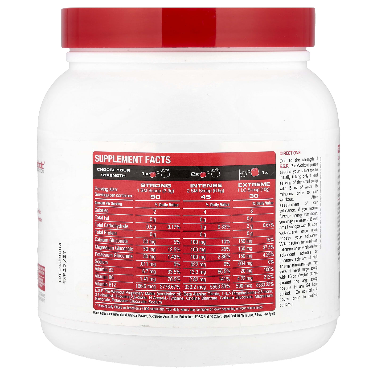 ESP от Metabolic Nutrition - это мультисиловая стимулирующая предтренировочная добавка, разработанная для обеспечения высокоинтенсивной энергии в отличие от любых других добавок на рынке. В отличие от других предтренировочных программ, которые принимают одну дозу для всех пользователей. ESP разработан, чтобы обеспечить желаемую энергию для потребителей, принимающих мало стимуляторов, а также тех, кто их употребляет. Кроме того, хотя продукты конкурентов страдают от кратковременного или неустойчивого уровня энергии с сомнительным вкусом ... Предтренировочный комплекс ESP обеспечивает стабильную энергию, стимулируемую сахаром, в течение 4+ часов с таким вкусовым профилем, который заставит вас жаждать его перед каждой тренировкой. Как и все продукты Metabolic Nutrition, предтренировочный комплекс ESP разработан и протестирован врачами с использованием только ингредиентов высочайшего качества, которые прошли строгие и строгие тесты.