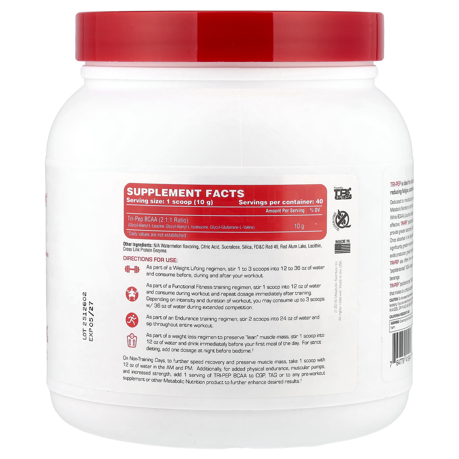 Компания, предназначенная для производства пищевых добавок, разработанных врачом, подтвержденная научными исследованиями и разработанная врачом; Metabolic Nutrition — первая компания, которая разработала и представила TRI-PEP — естественные аминокислоты с разветвленной цепью (BCAA), с пептидной связью на рынке. Хотя аминокислоты с разветвленной цепью (лейцин, изолейцин и валин) необходимы, в обычных аминокислотах с разветвленной цепью в свободной форме отсутствуют кофакторы, обеспечивающие эффективный метаболизм BCAA. BCAA с пептидной связью TRI-PEP содержит правильное соотношение этих важных метаболических кофакторов и имеет уникальную химическую структуру, чтобы обеспечить лучшее всасывание и биодоступность. Таким образом, повышается концентрация аминокислот в плазме крови, что приводит к большему насыщению мышц BCAA. После всасывания в кровоток BCAA с пептидной связью TRI-PEP повышает уровень гликогена в мышцах и подавляет накопление молочной кислоты, обеспечивая значительно повышение выносливости и предотвращая разрушение мышечной ткани. TRI-PEP также поддерживает улучшенный синтез белка и оксида азота, уровень гормона роста и высвобождение IGF-1 для сохранения и укрепления сухой мышечной массы. Кроме того, TRI-PEP отличается от обычных и растворимых BCAA, которые имеют репутацию продукта, который плохо смешивается и оставляет горькое химическое послевкусие. BCAA с пептидной связью из TRI-PEP, эксклюзивный процесс HYDRA-SORB™, обеспечивает легко смешивание и обеспечивает отличный вкус при смешивании с водой или любимым напитком.