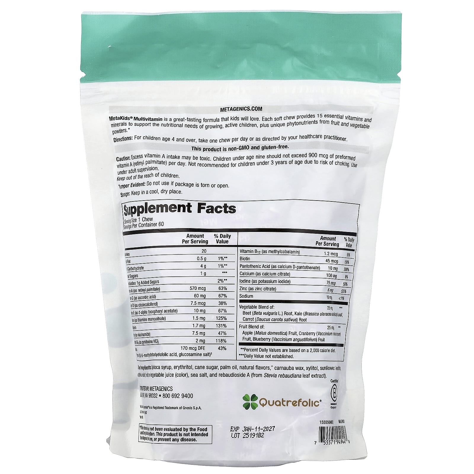 Мультивитамины MetaKids® - это средство с превосходным вкусом, которое понравится детям. Каждая жевательная таблетка содержит 15 незаменимых витаминов и минералов для удовлетворения потребностей в питательных веществах растущих и активных детей, а также уникальные фитонутриенты из порошков из фруктов и овощей.