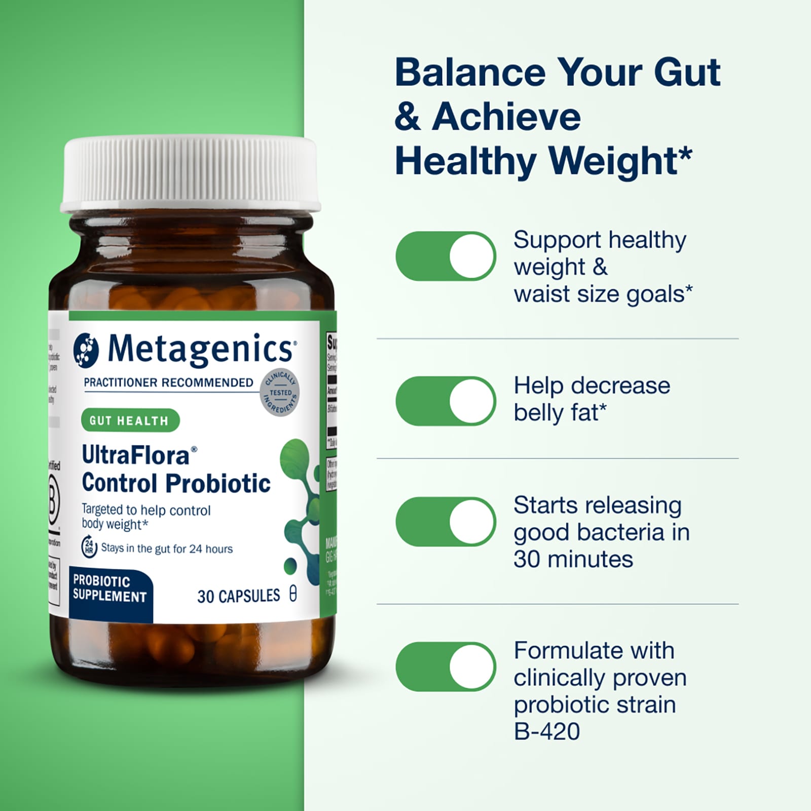 Пробиотик UltraFlora® Control разработан, чтобы помочь регулировать здоровый вес, обеспечивая специфическую пробиотическую поддержку с бифидобактериями лактис B-420 ™, которые, как было доказано, помогают управлять жиром и весом.
