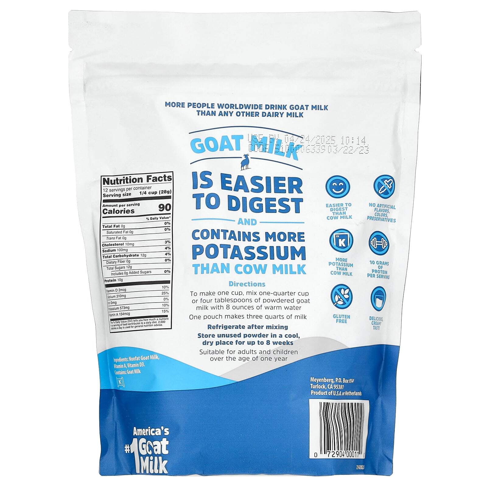 Чтобы приготовить одну чашку, смешайте четверть стакана или четыре столовых ложки сухого козьего молока с 240 мл (8 унциями) теплой воды. Одного пакетика хватает на три литра молока.