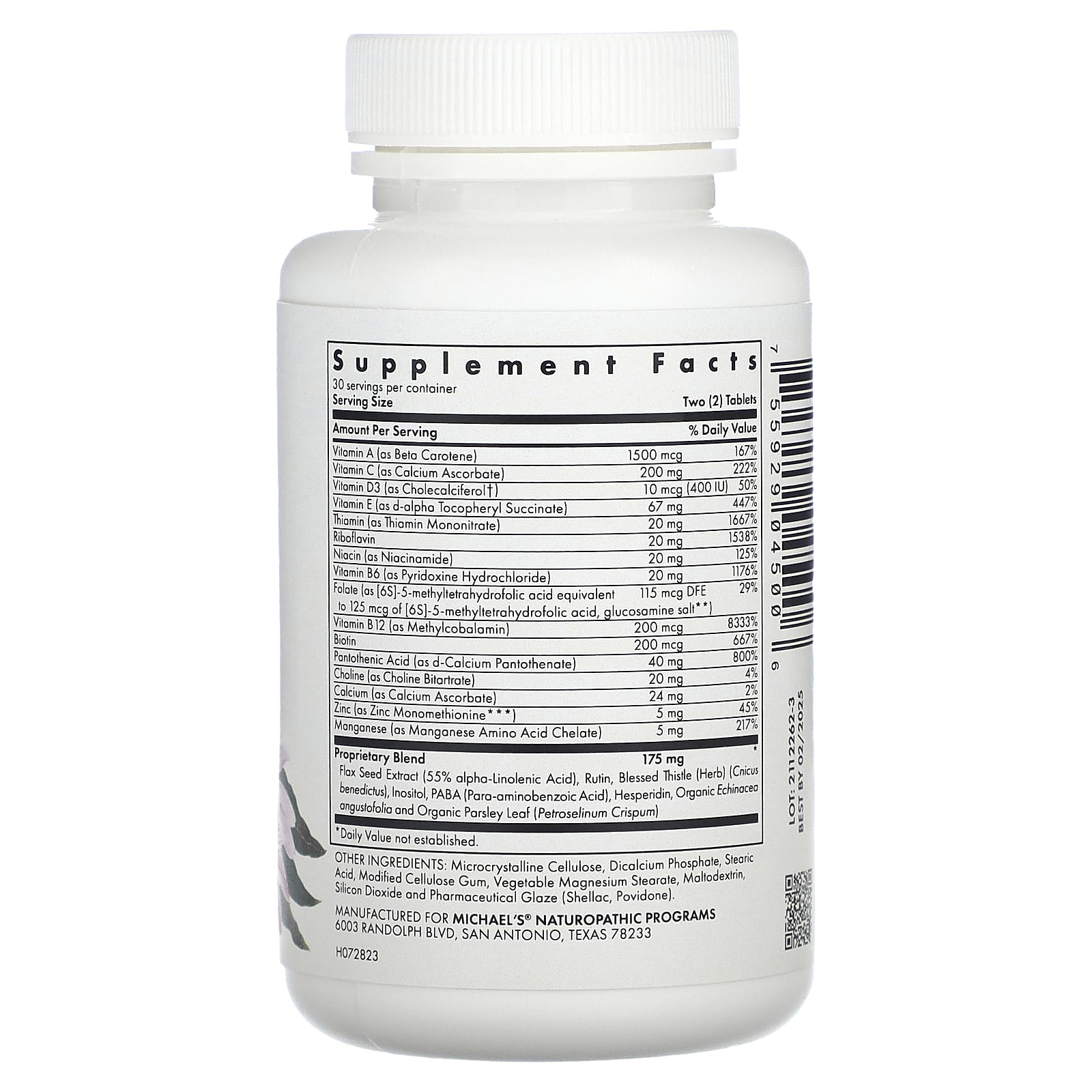 | Запатентованная смесь экстракт семян льна (55% альфа-линоленовой кислоты), рутин, трава кникуса благословенного (Cnicus benedictus), инозитол, ПАБК (пара-аминобензойная кислота), гесперидин, органическая эхинацея узколистная и органические листья петрушки (Petroselinum Crispum) | 175 мг | * |