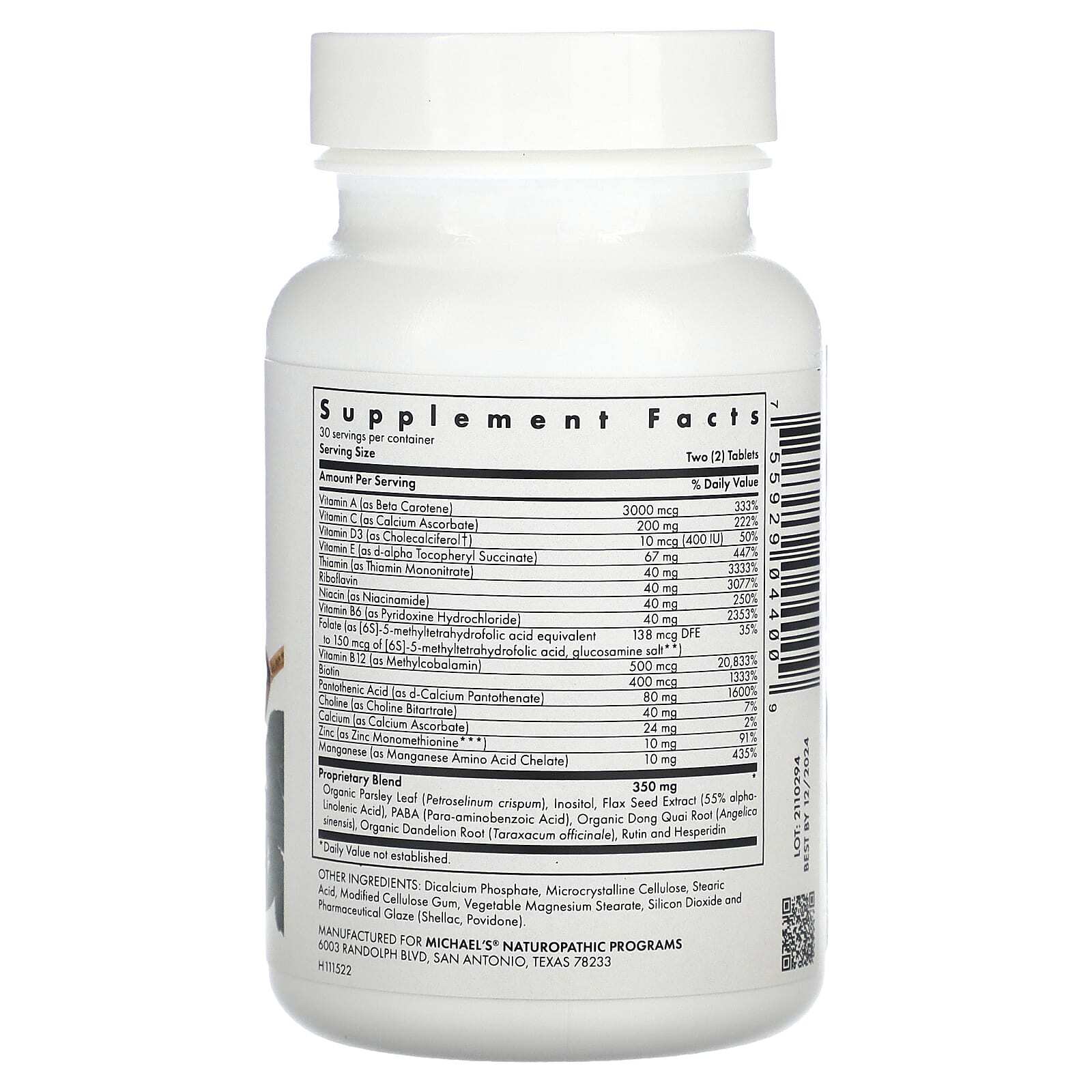 Запатентованнаясмесь органические листья петрушки (Petroselinum crispum), инозитол, экстракт семян льна (55% альфа-линоленовой кислоты), ПАБК (парааминобензойная кислота), органический корень дягиля лекарственного (Angelica sinensis), органический корень одуванчика (Taraxacum officinale), рутин и гесперидин | 350 мг | * |