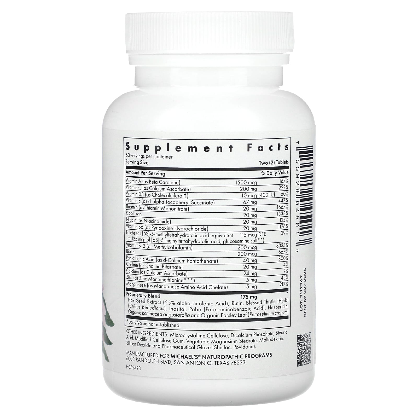 | Собственная смесь Экстракт семян льна (55% альфа-линоленовая кислота), рутин, благословенный чертополох (трава) (Cnicus benedictus), Инозитол, ПАБА (парааминобензойная кислота), Органическая эхинацея angustifolia, Гесперидин и лист органических петрушки (petroselinum crispum) | 175 мг | * |