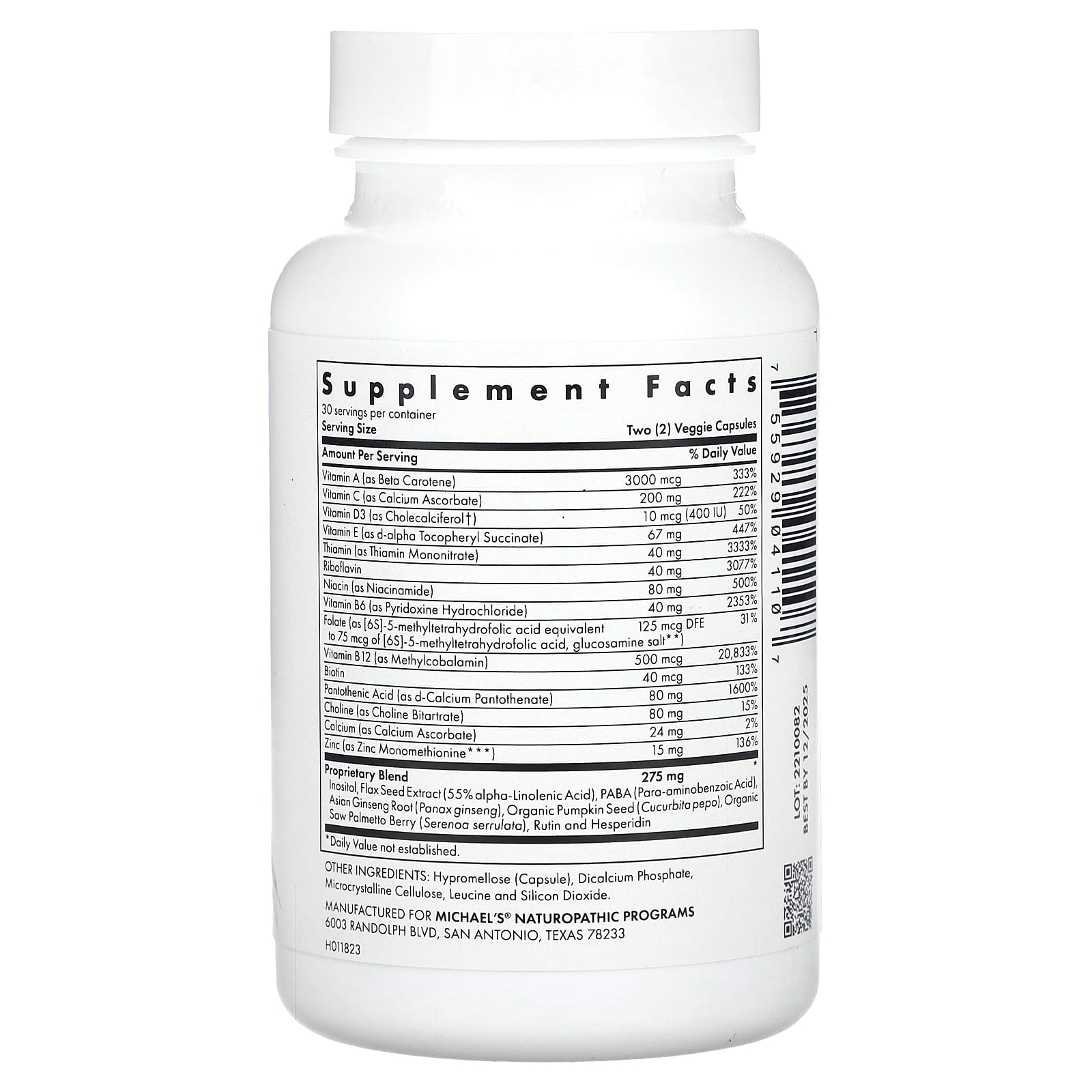 | Запатентованная смесь: инозитол, экстракт семян льна (55% альфа-линоленовой кислоты), ПАБК (парааминобензойная кислота), корень азиатского женьшеня (Panax ginseng), органические семена тыквы (Cucurbita pepo), органические ягоды серенои (Serenoa serrulata), рутин и гесперидин | 275 мг | * |