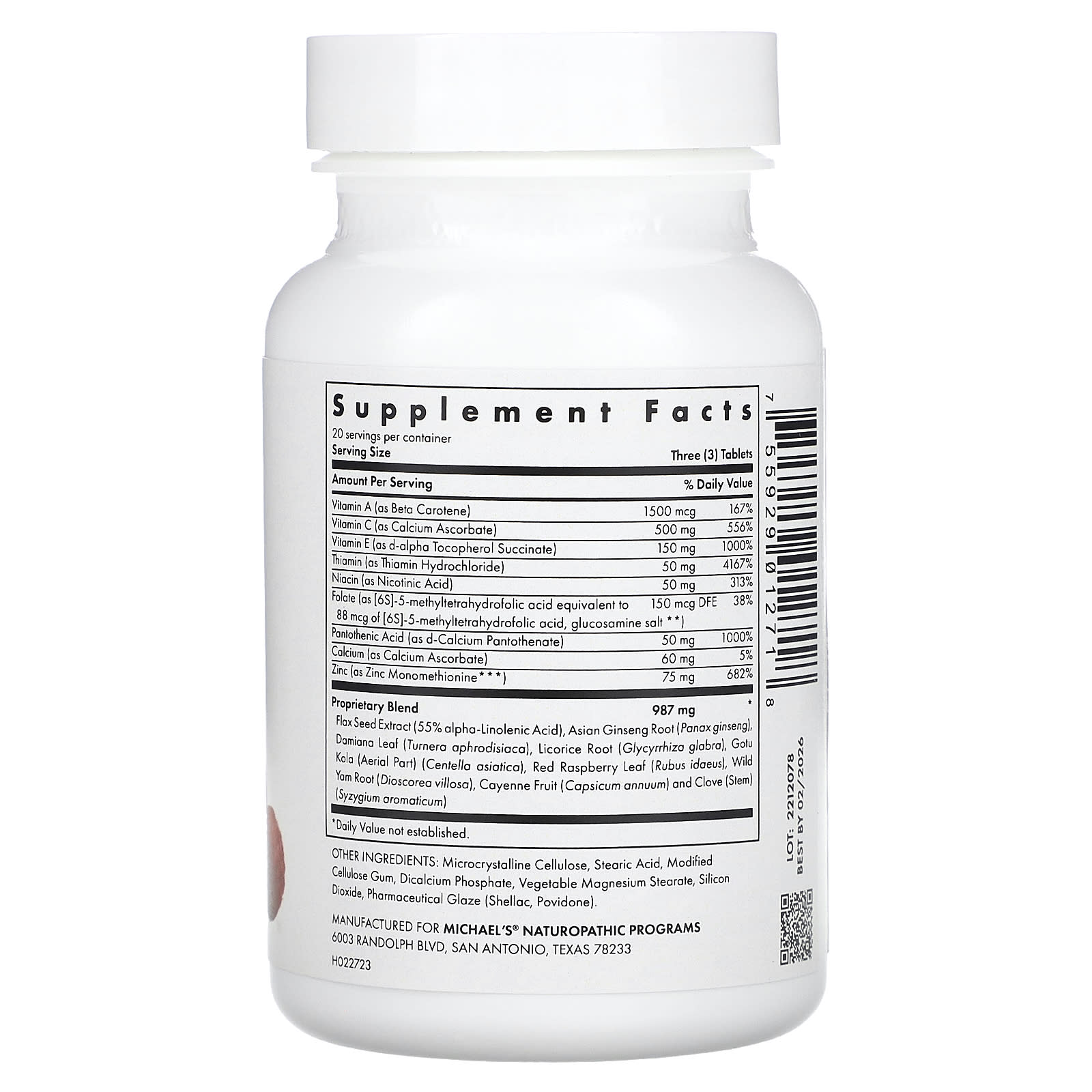 | Запатентованная смесь экстракт семян льна (55% альфа-линоленовой кислоты), корень женьшеня азиатского (Panax ginseng), листья дамианы (Turnera aphrodisiaca), корень солодки (Glycyrrhiza glabra), готу кола (надземная часть) (Centella asiatica), листья красной малины (Rubus idaeus), корень дикого ямса (Dioscorea villosa), плоды кайенского перца (Capsicum annuum) и стебель гвоздики (Syzygium aromaticum) | 987 мг | * |