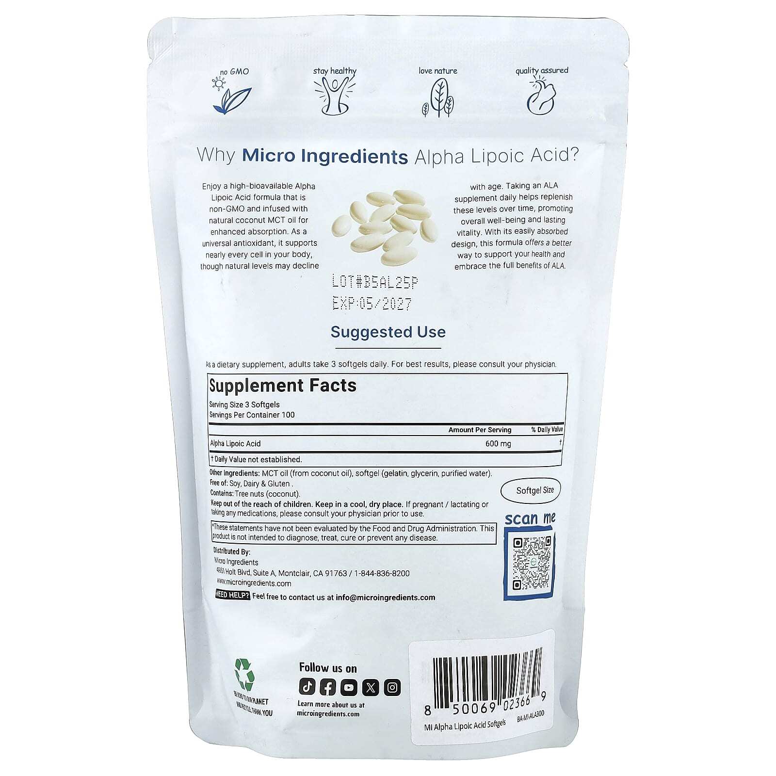 Наслаждайтесь формулой с альфа-липоевой кислотой с высокой биодоступностью, которая не содержит ГМО и содержит натуральное кокосовое масло MCT для лучшего усвоения. В качестве универсального антиоксиданта он поддерживает почти каждую клеточку вашего организма, хотя естественный уровень может снижаться с возрастом. Ежедневный прием добавок с АЛК помогает восполнить этот уровень с течением времени, способствуя общему благополучию и жизненной силе. Благодаря легко усваиваемой форме эта формула предлагает лучший способ поддержать ваше здоровье и использовать все преимущества АЛК.
