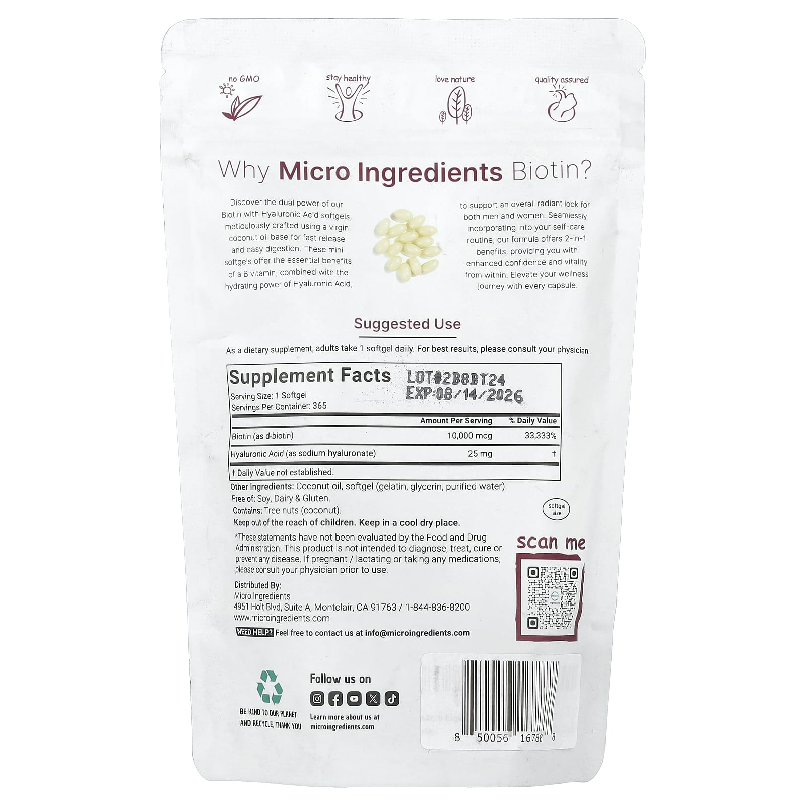 Откройте для себя двойную силу наших мягких таблеток биотина с гиалуроновой кислотой, тщательно созданных с использованием основы из чистого кокосового масла для быстрого высвобождения и легкого усвоения. Эти мини-капсулы обладают основными преимуществами витамина B в сочетании с увлажняющей силой гиалуроновой кислоты, чтобы поддерживать общий сияющий вид как для мужчин, так и для женщин. Наша формула предлагает преимущества 2-в-1, которые легко интегрируются в ваш ежедневный уход за собой, придавая вам уверенность и бодрость изнутри. Улучшите свое здоровье с каждой капсулой.