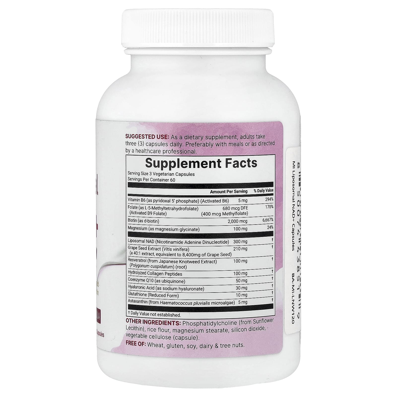 Формула 12 в 1 для женского здоровья: Содержит липосомальный НАД+ в сочетании с экстрактом виноградных косточек, ресвератролом, пептидами коллагена, коэнзимом Q10, гиалуроновой кислотой, глутатионом, астаксантином, активированным витамином B6 (P5P), метилфолатом, биотином и глицинатом магния для широкого спектра действия добавки.