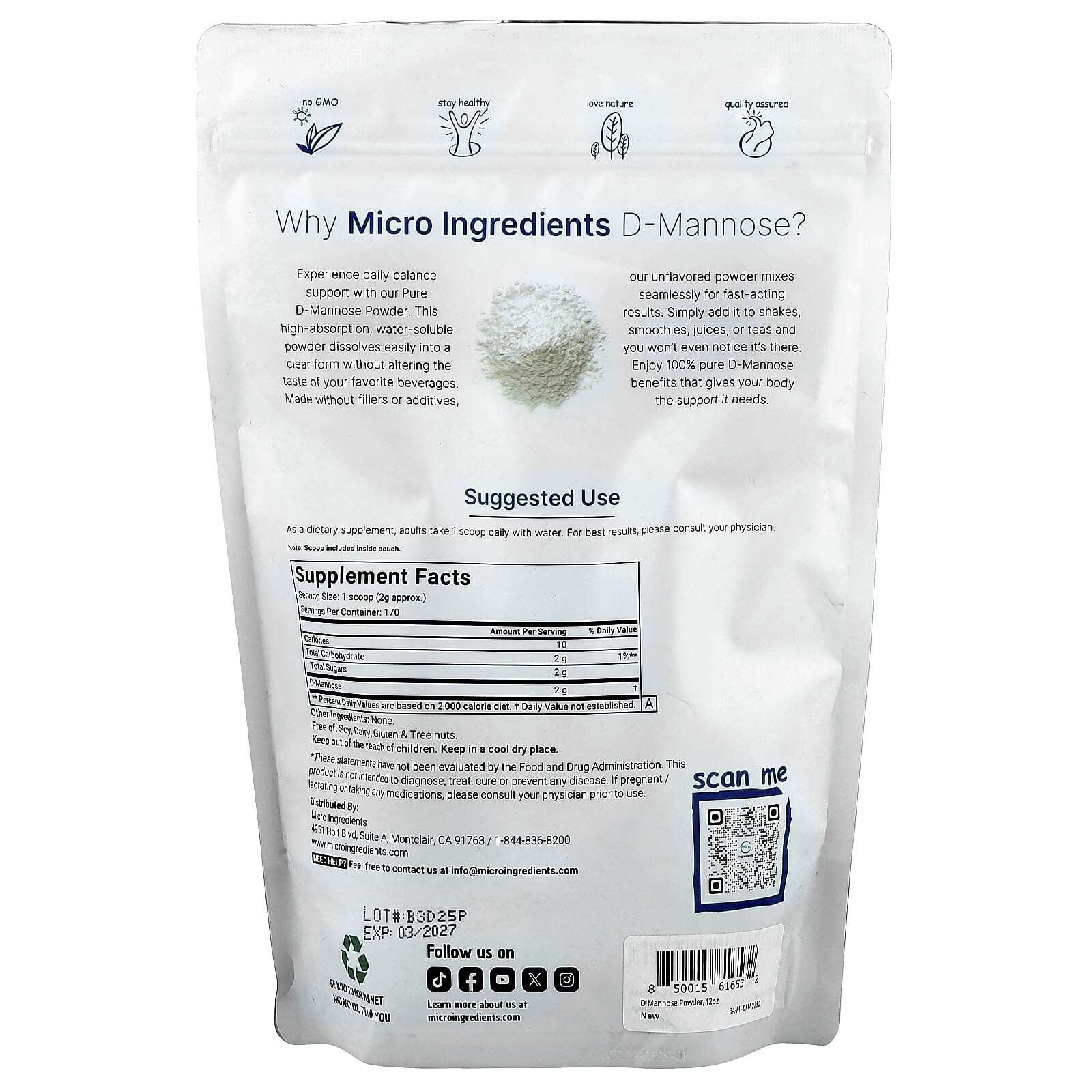 Micro Ingredients предлагает чистую порошкообразную D-маннозу, 340 г (12 унций), быстро растворяется в воде и подходит для веганов.