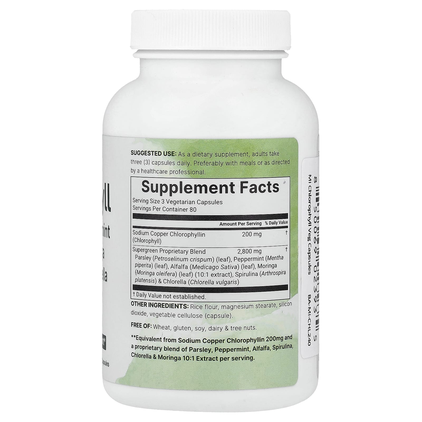 Каждый пакетик содержит 240 натуральных растительных капсул, содержащих эквивалент 3000 мг хлорофилла в виде натрий-медного хлорофиллина, а также смесь суперфудов, включая петрушку, перечную мяту, люцерну, морингу, спирулину и хлореллу.