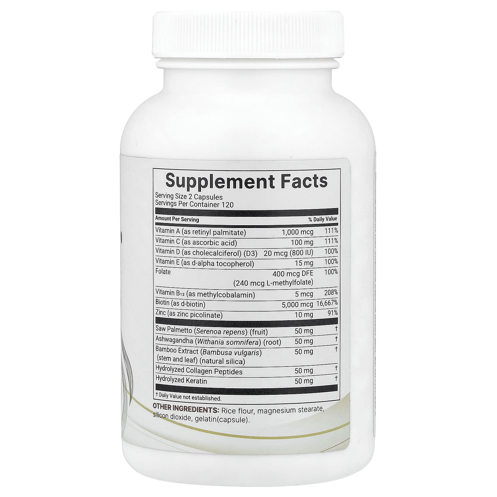 Добавленные в состав биотин, цинк, кератин, железо и коллаген действуют вместе, чтобы обеспечить силу и густоту существующих волос, а также рост новых волос.