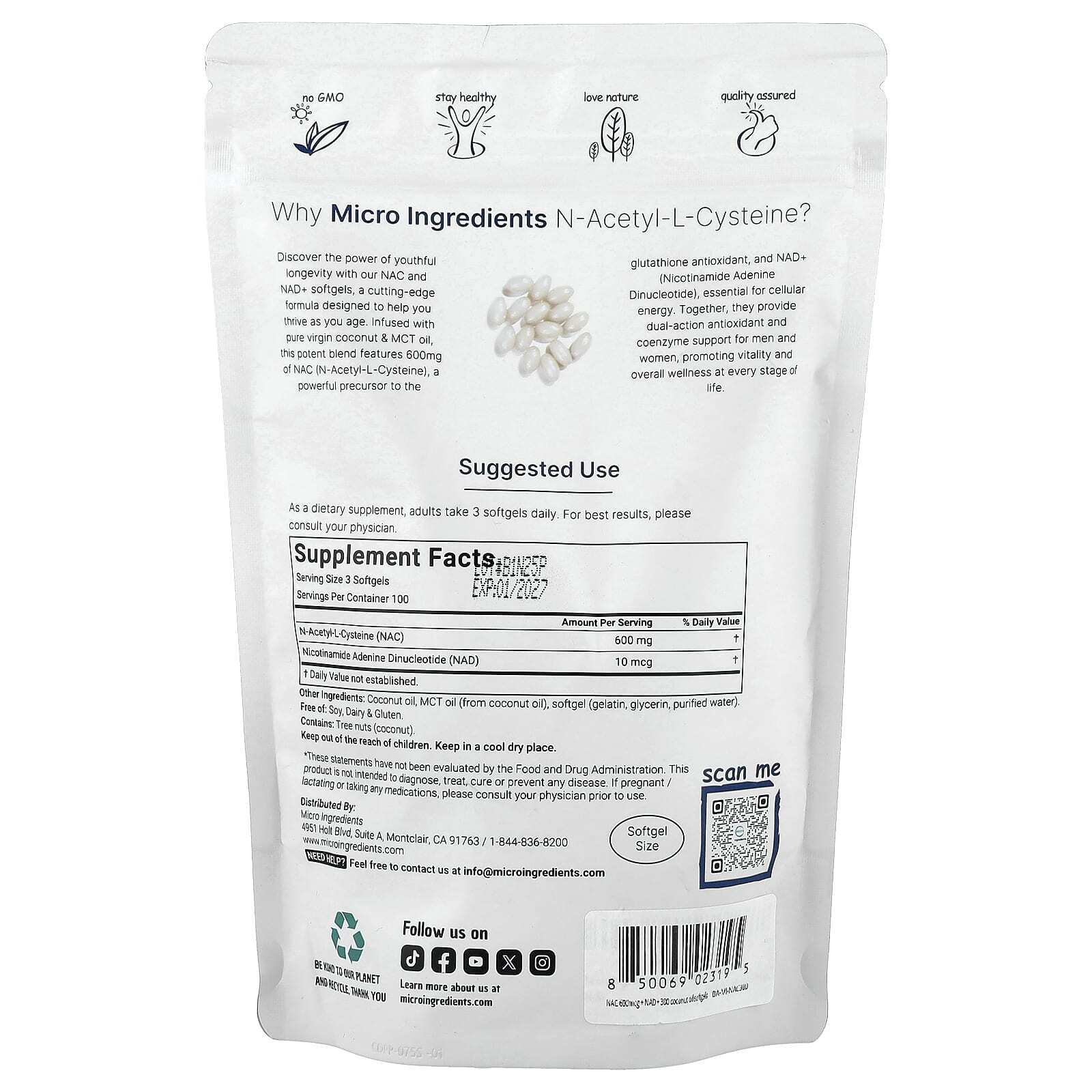 Откройте для себя силу молодости и долголетия с нашими капсулами NAC и NAD +, передовой формулой, разработанной, чтобы помочь вам развиваться с возрастом. Эта эффективная смесь, насыщенная чистым кокосовым маслом первого отжима и маслом MCT, содержит 600 мг NAC (N-ацетил-L-цистеина), мощного предшественника антиоксиданта глутатиона, и NAD + (никотинамид адениндинуклеотид), необходимого для клеточной энергии. Вместе они обеспечивают антиоксидантную и коферментную поддержку двойного действия для мужчин и женщин, способствуя их жизненному тонусу и хорошему самочувствию на каждом этапе жизни.
