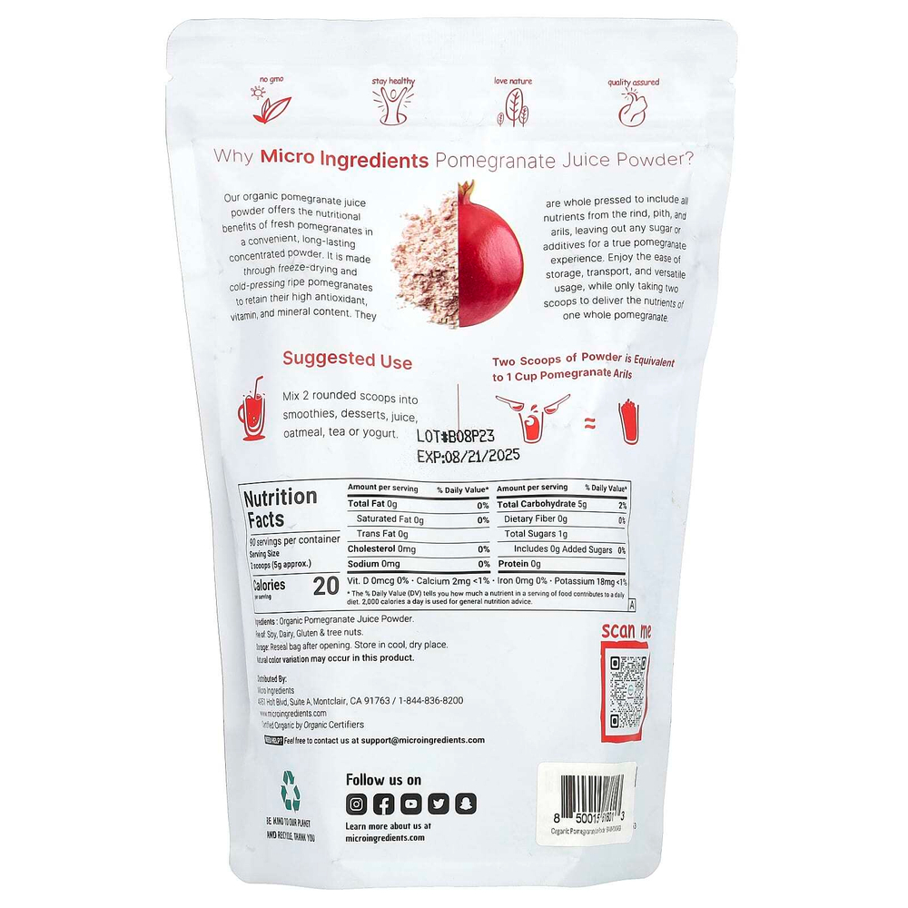 Наш органический порошок из гранатового сока обладает питательными свойствами свежих гранатов в удобном и стойком концентрированном порошке. Его получают путем сублимационной сушки и холодного отжима спелых гранатов, чтобы сохранить их высокое содержание антиоксидантов, витаминов и минералов. Гранат целиком состоит из цельных питательных веществ, включая его кожуру, сердцевину и плод, без добавления сахара и добавок. Наслаждайтесь удобством хранения, транспортировки и универсальным использованием, а всего две мерные ложки обеспечат питательные вещества одного целого граната.