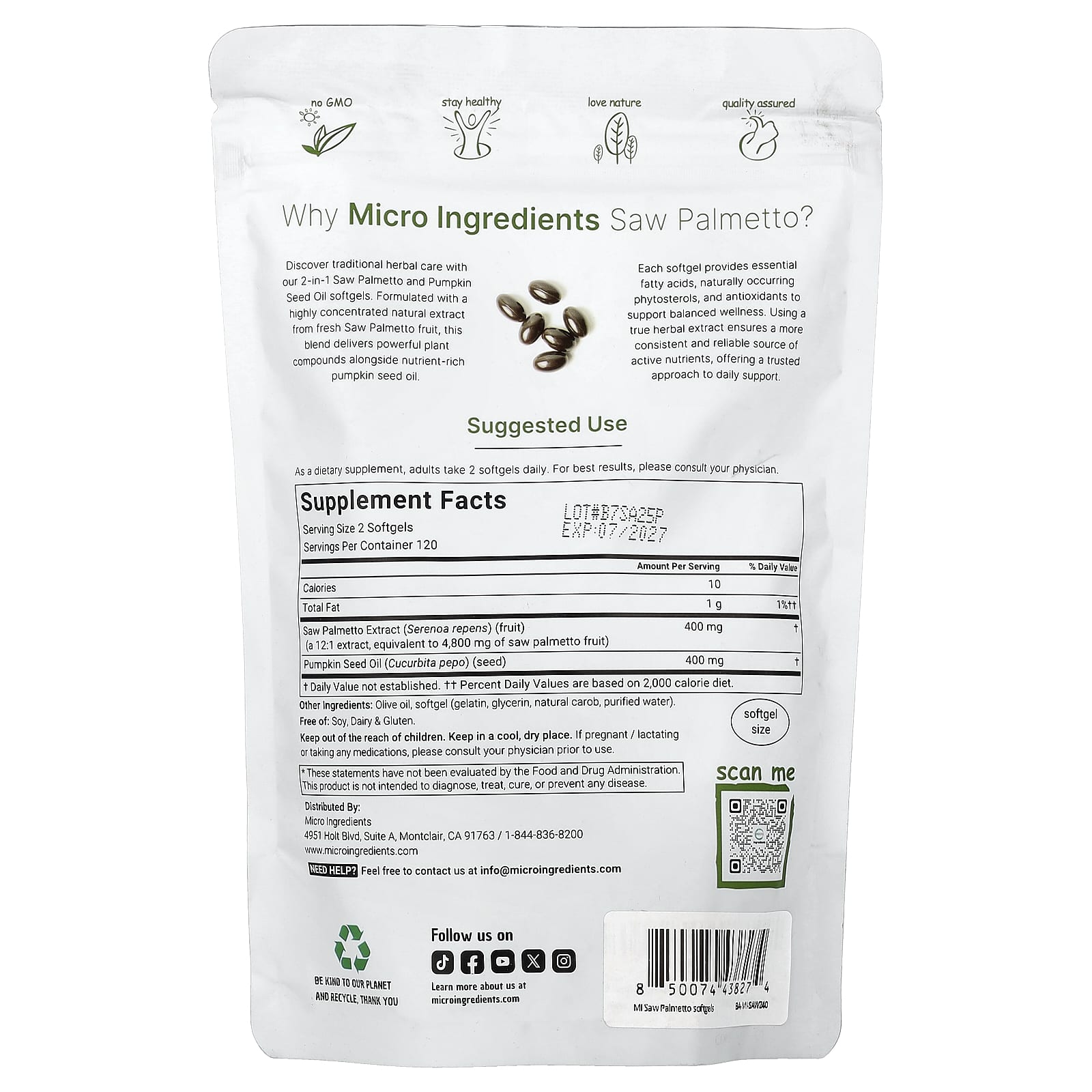 Откройте для себя традиционный травяной уход с помощью наших капсул с маслом серенои и тыквенных семечек 2 в 1. Эта смесь, созданная на основе высококонцентрированного натурального экстракта свежих плодов серенои, содержит эффективные растительные соединения, а также богатое питательными веществами масло семян тыквы. Каждая капсула содержит незаменимые жирные кислоты, натуральные фитостеролы и антиоксиданты для поддержания хорошего самочувствия. Использование настоящего экстракта трав обеспечивает более стабильный и надежный источник активных питательных веществ, предлагая надежный подход к ежедневной поддержке.